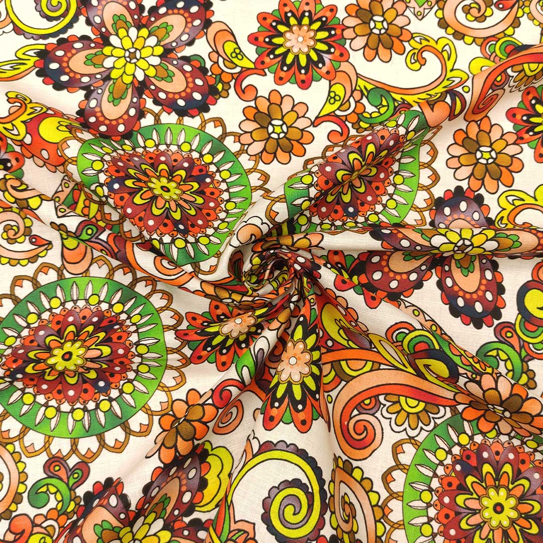 Tessuto Cotone e Lino a fantasia motivo etnico rosso – arancione – verde