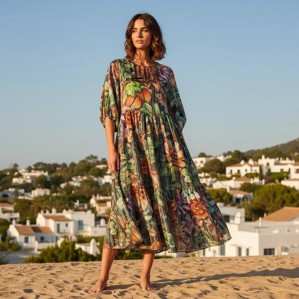 Tessuto Cotone e Lino a fantasia dalla mano morbida, leggera e fresca, ideale per realizzare capi comodi e freschi come: abiti, gonne, pantaloni e camicie.