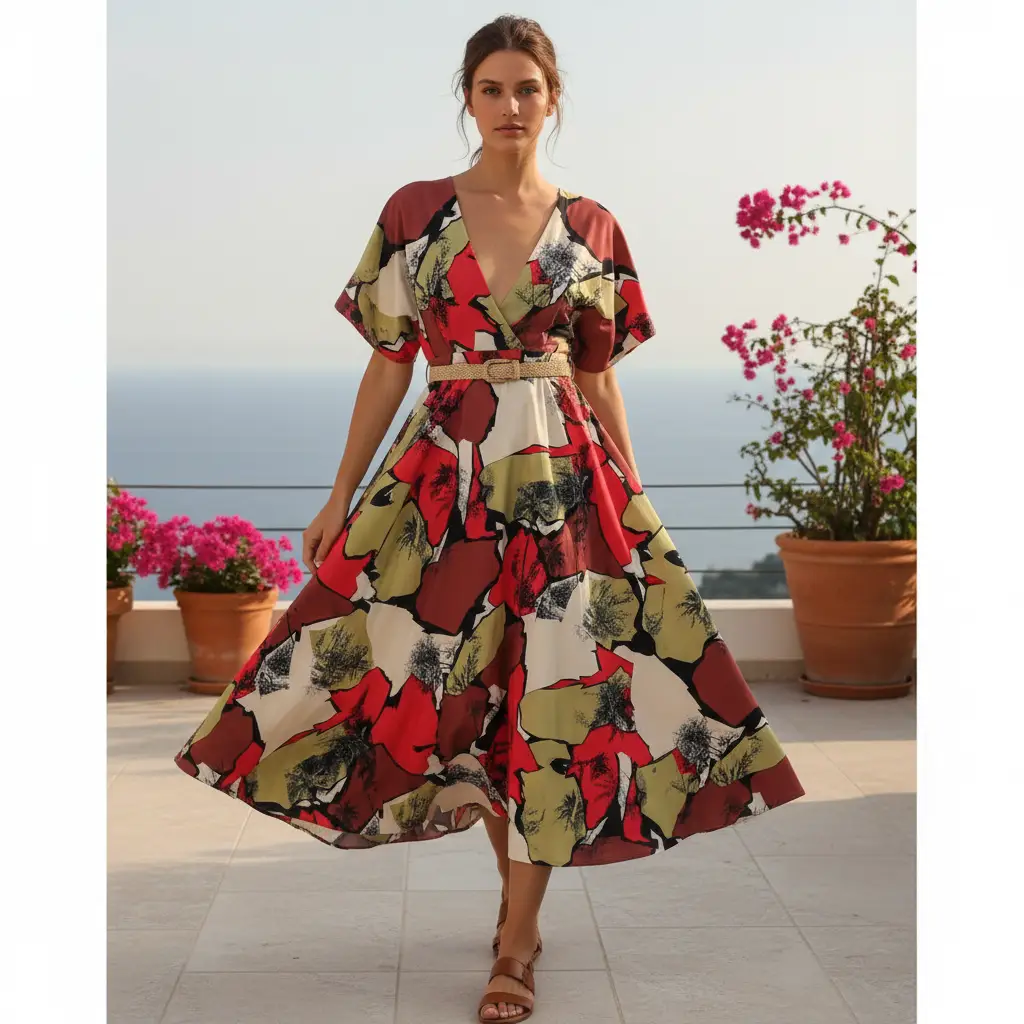 Tessuto Cotone leggero a fantasia motivo astratto beige – bordeaux – verde militare