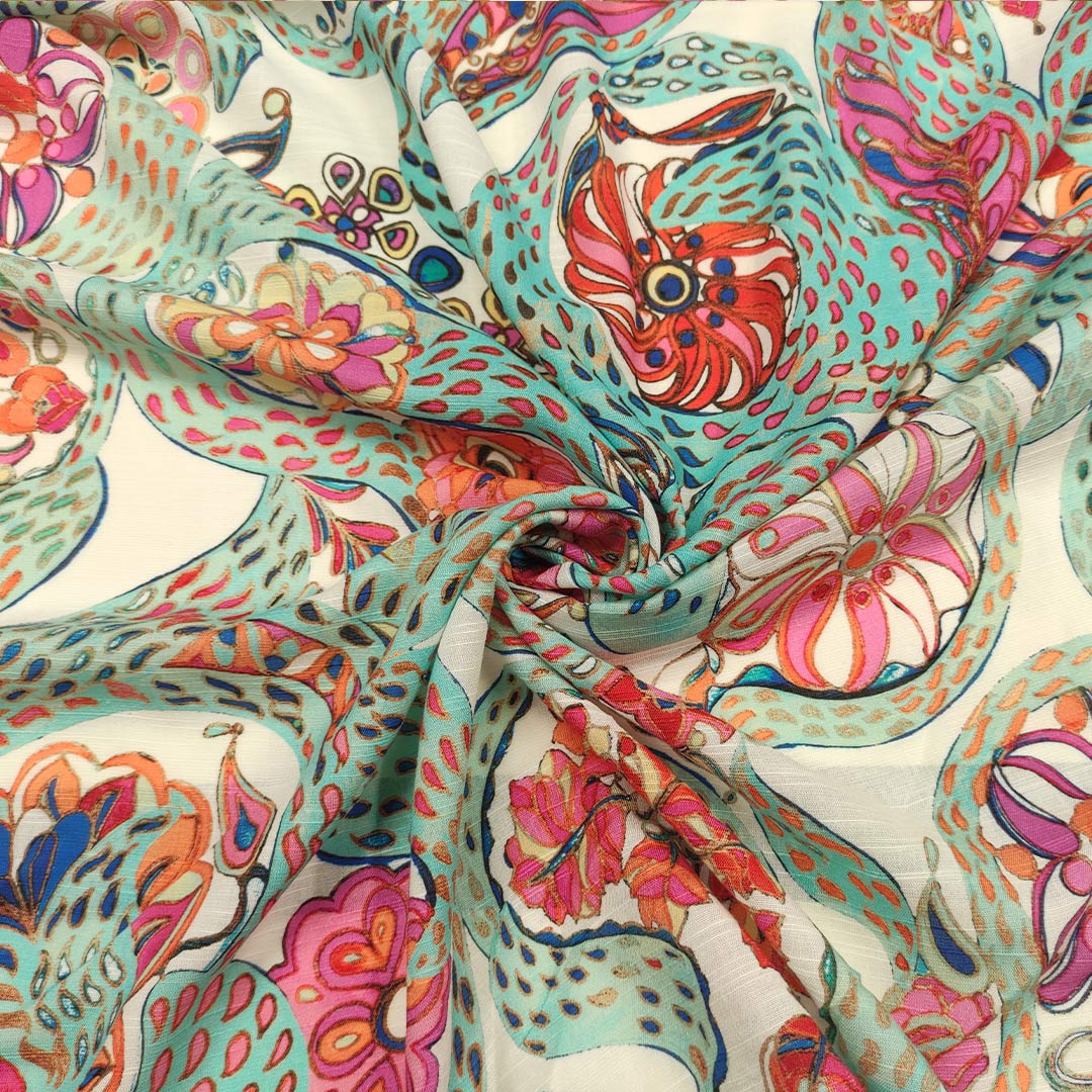 Tessuto Cotone leggero a fantasia dalla mano morbida, leggera e fresca, ideale per realizzare capi freschi come: abiti, gonne, pantaloni e camicie.