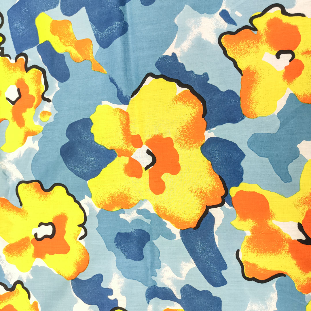 Tessuto Cotone leggero a fantasia motivo floreale celeste – blu elettrico – arancio