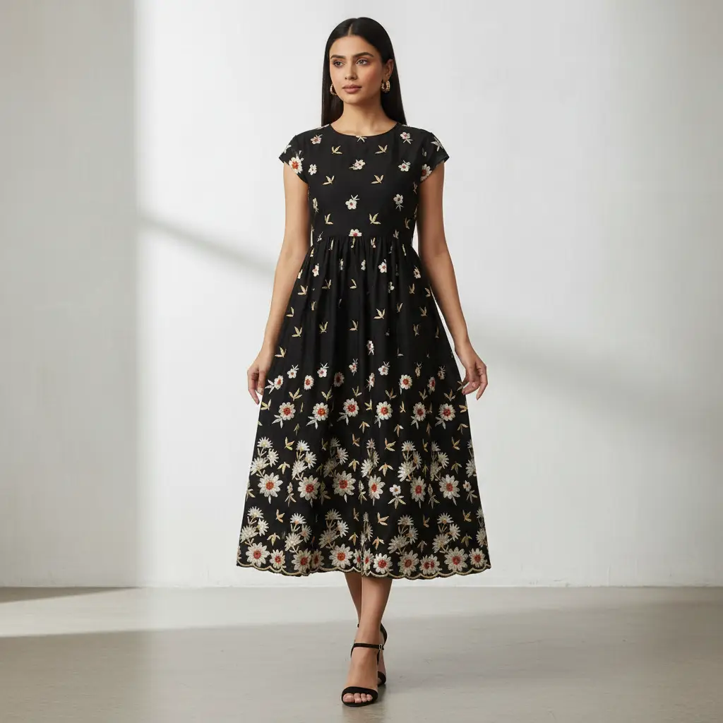 Tessuto Cotone Ricamato motivo floreale nero – beige – coccio