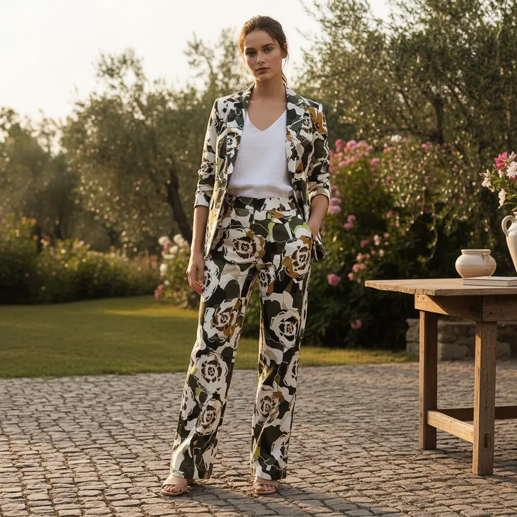 Tessuto Gabardine di cotone a fantasia, leggermente elasticizzato si presta alla creazione di capi freschi e comodi da utilizzare nella stagione primavera – estate come: pantaloni, gonne, giacche ed abiti.