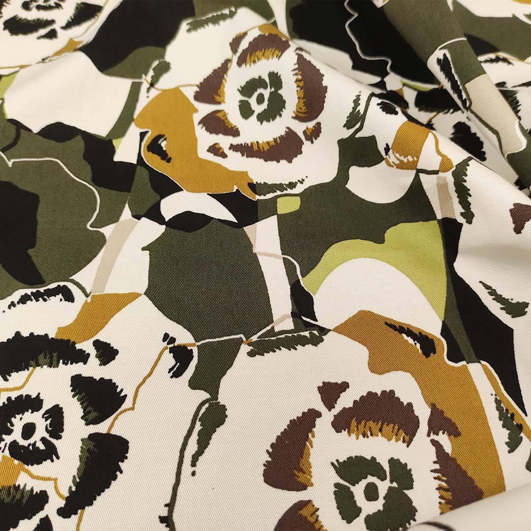 Tessuto Gabardine di Cotone a fantasia motivo floreale bianco – beige – verde militare