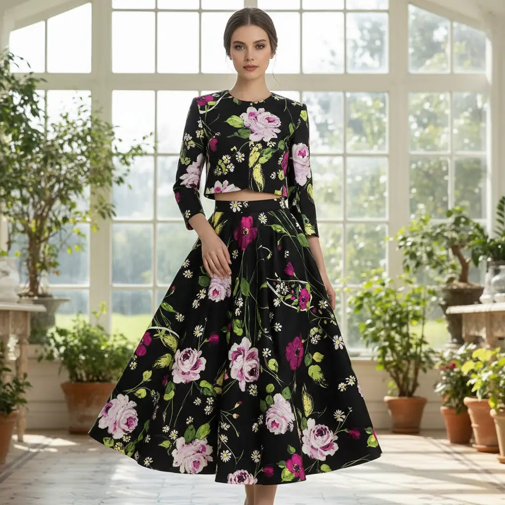 Tessuto Gabardine di Cotone a fantasia motivo floreale nero – ciclamino – verde