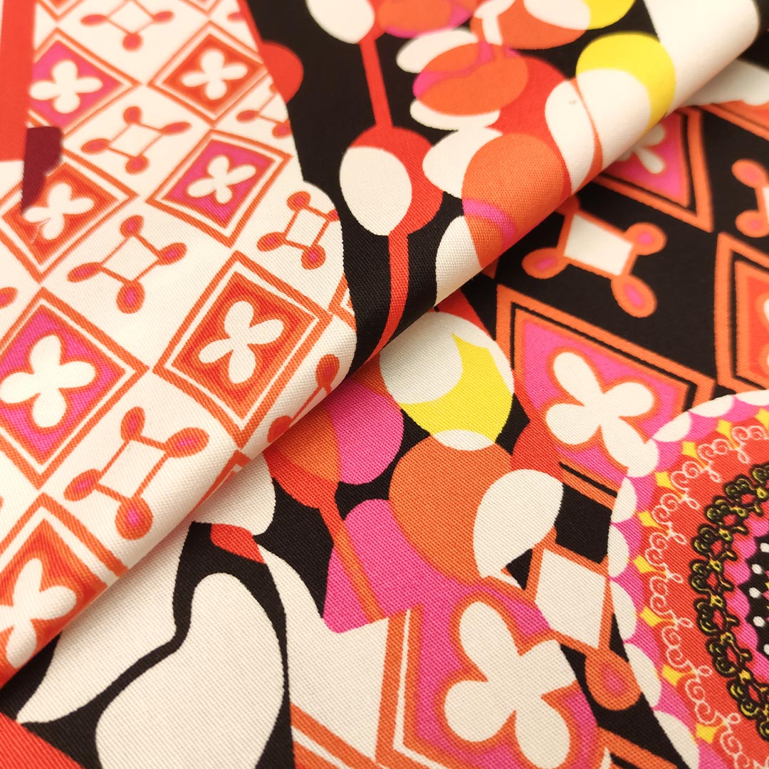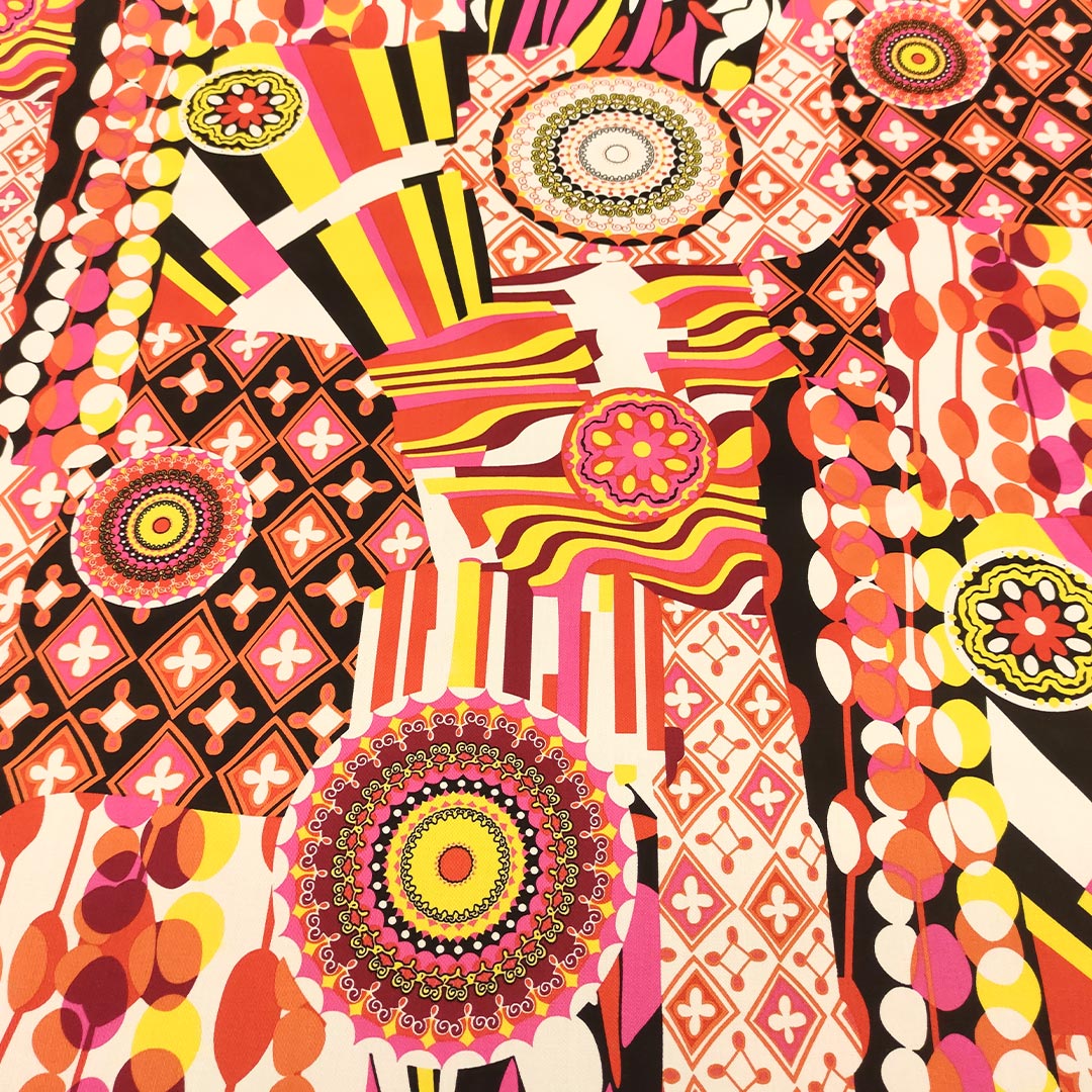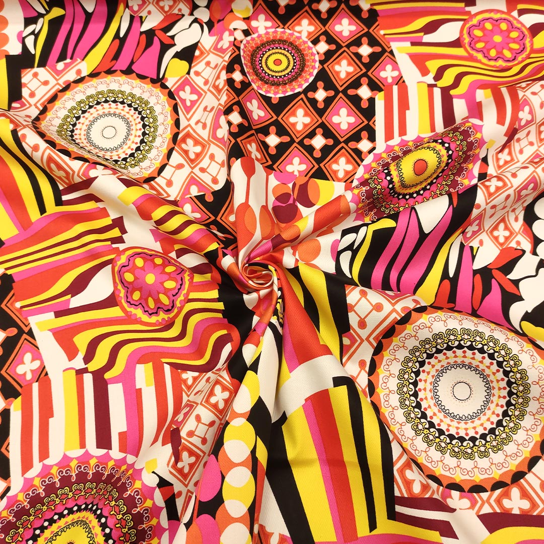 Tessuto Gabardine di Cotone a fantasia motivo geomatrico fucsia – giallo – nero – bianco