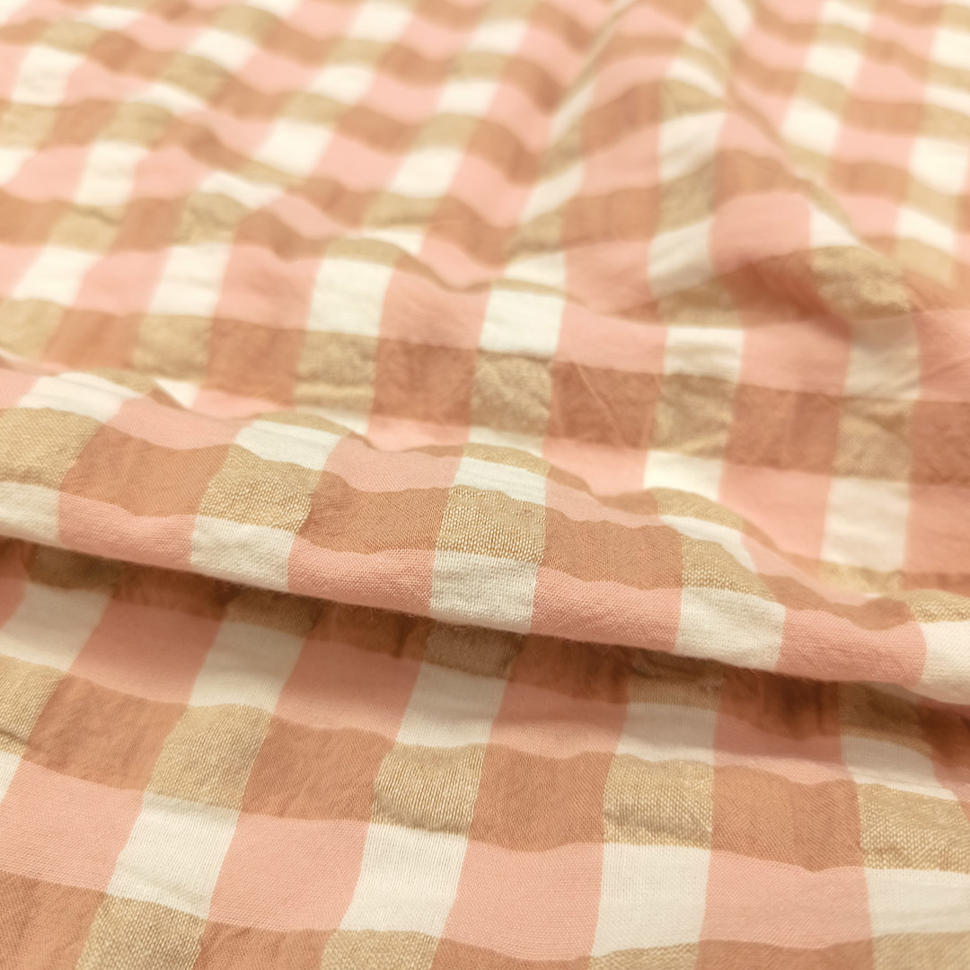Tessuto Mussola di Cotone effetto stropicciato motivo quadri rosa – beige – bianco