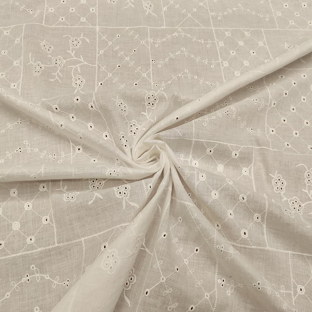 Tessuto Mussola di Cotone ricamato dalla mano leggera e fresca, ideale per realizzare capi comodi e freschi come: abiti, gonne, pantaloni e camicie.