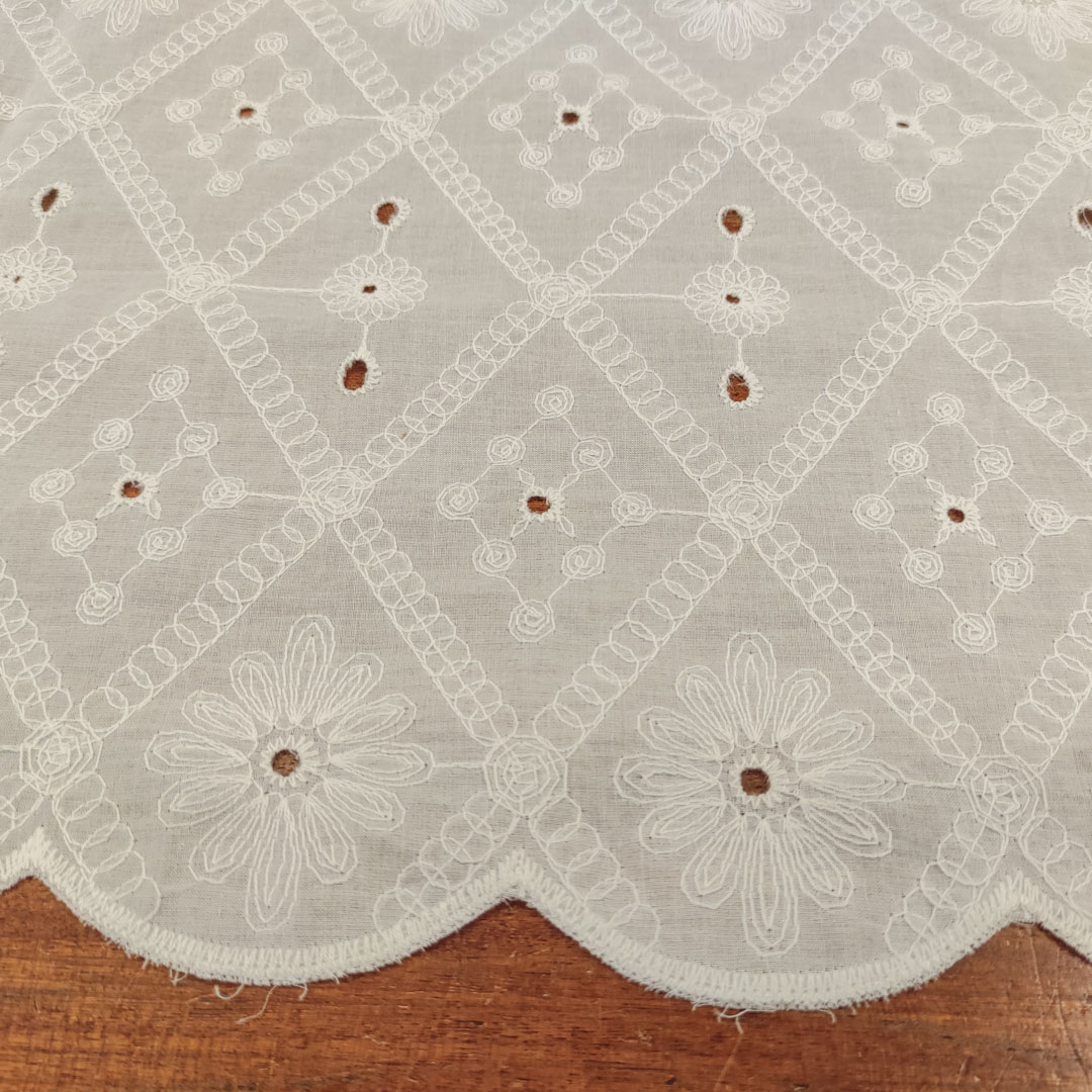 Tessuto Mussola ricamato dalla mano leggera e fresca, ideale per realizzare capi comodi e freschi come: abiti, gonne, pantaloni e camicie.