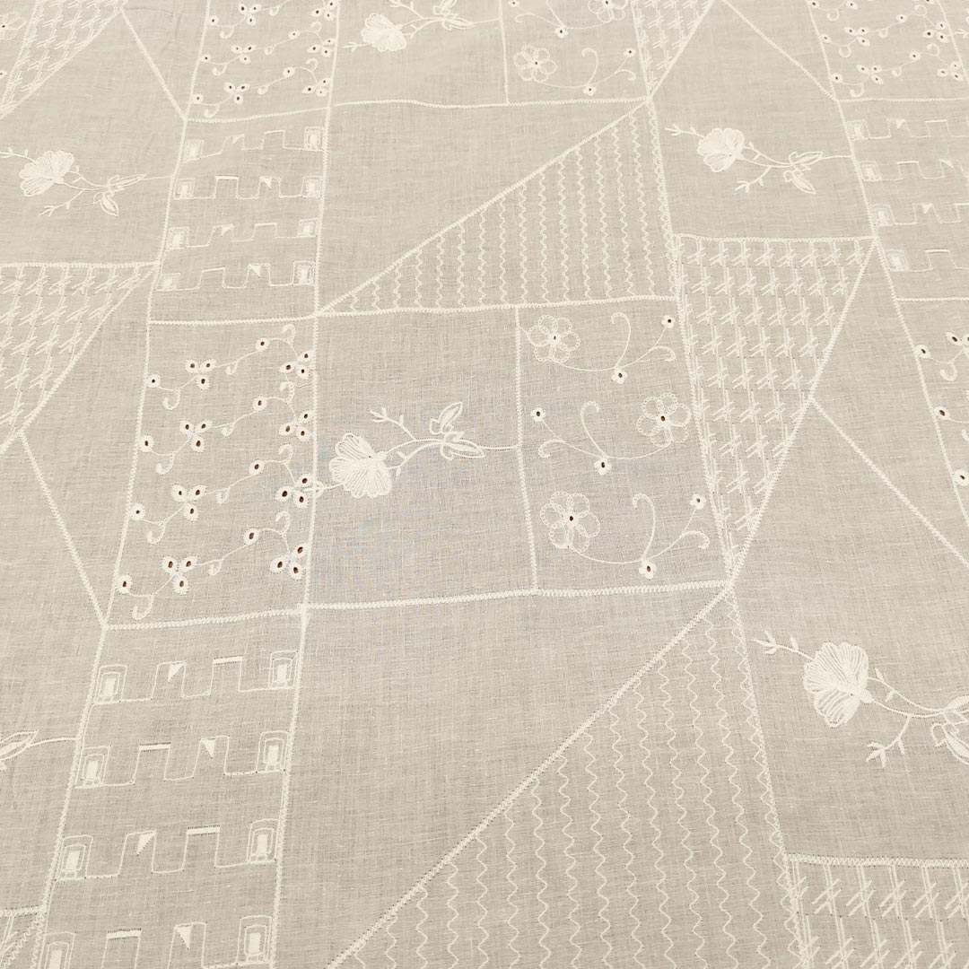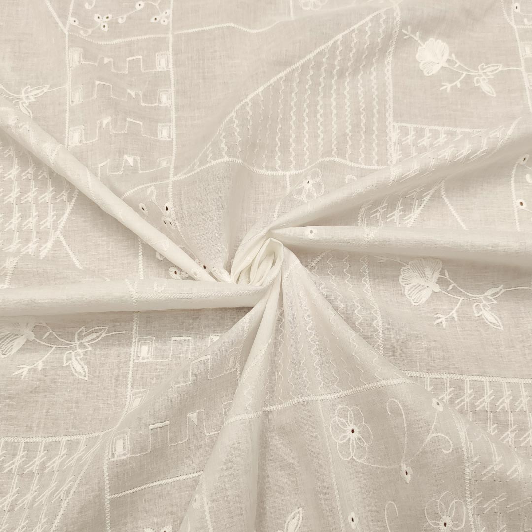 Tessuto Mussola di Cotone ricamato motivo floreale astratto bianco seta
