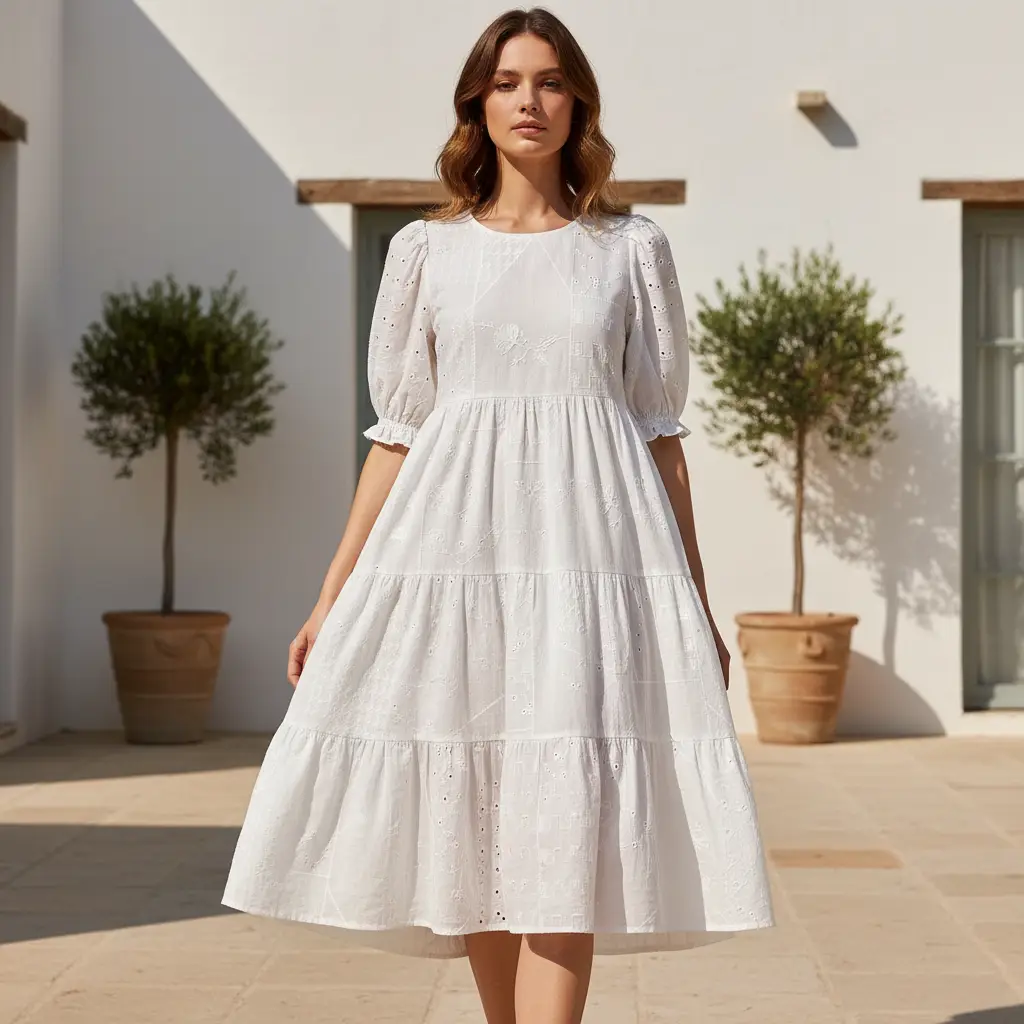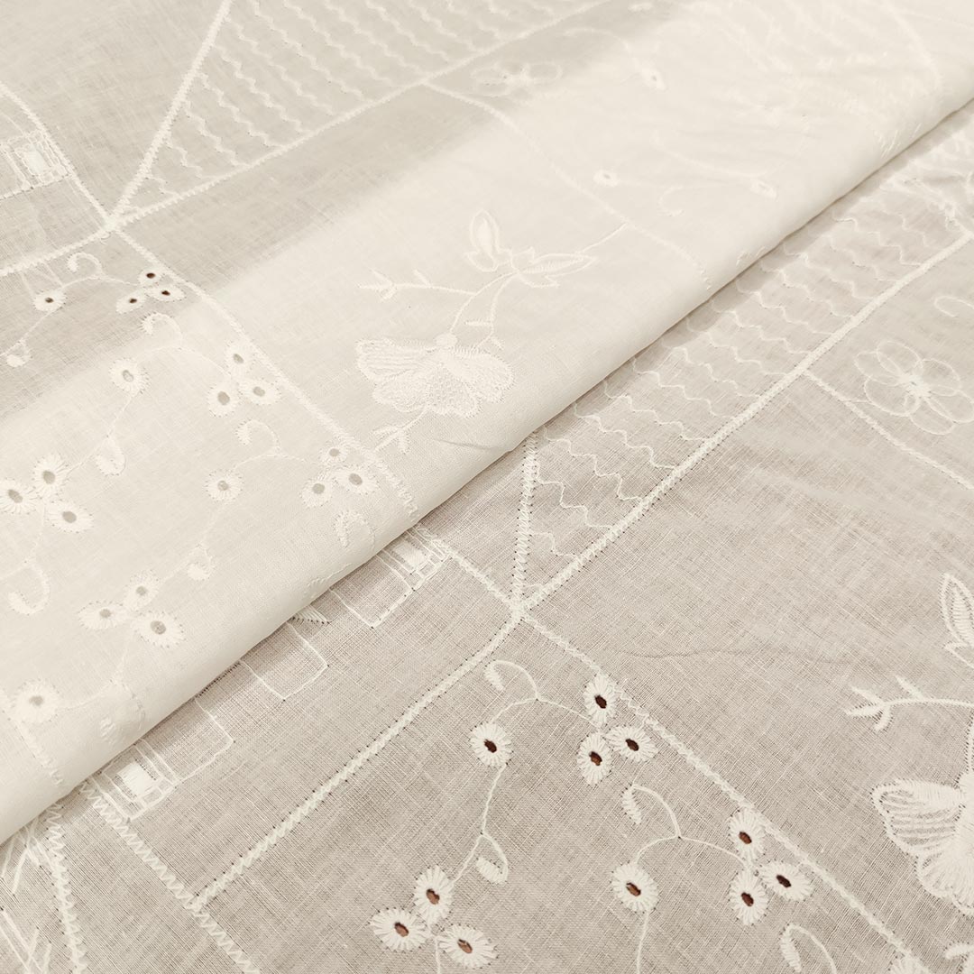 Tessuto Mussola di Cotone ricamato dalla mano leggera e fresca, ideale per realizzare capi comodi e freschi come: abiti, gonne, pantaloni e camicie.