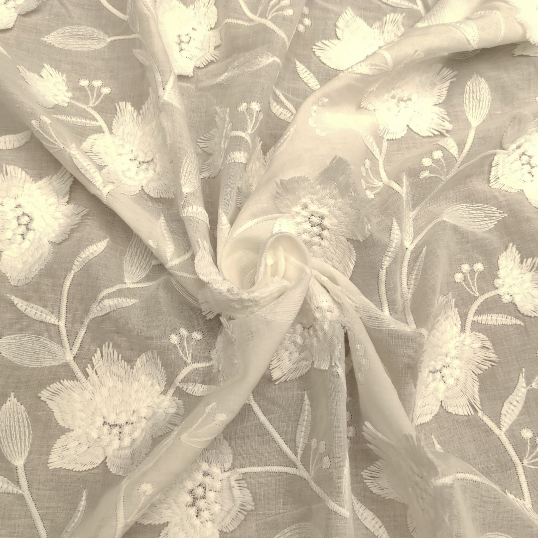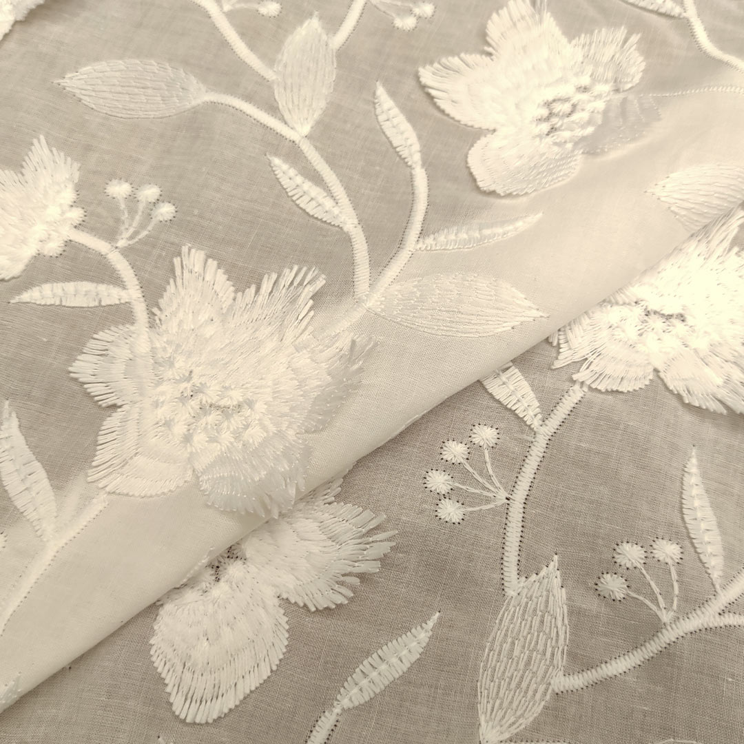 Tessuto Mussola di Cotone ricamato motivo floreale bianco seta