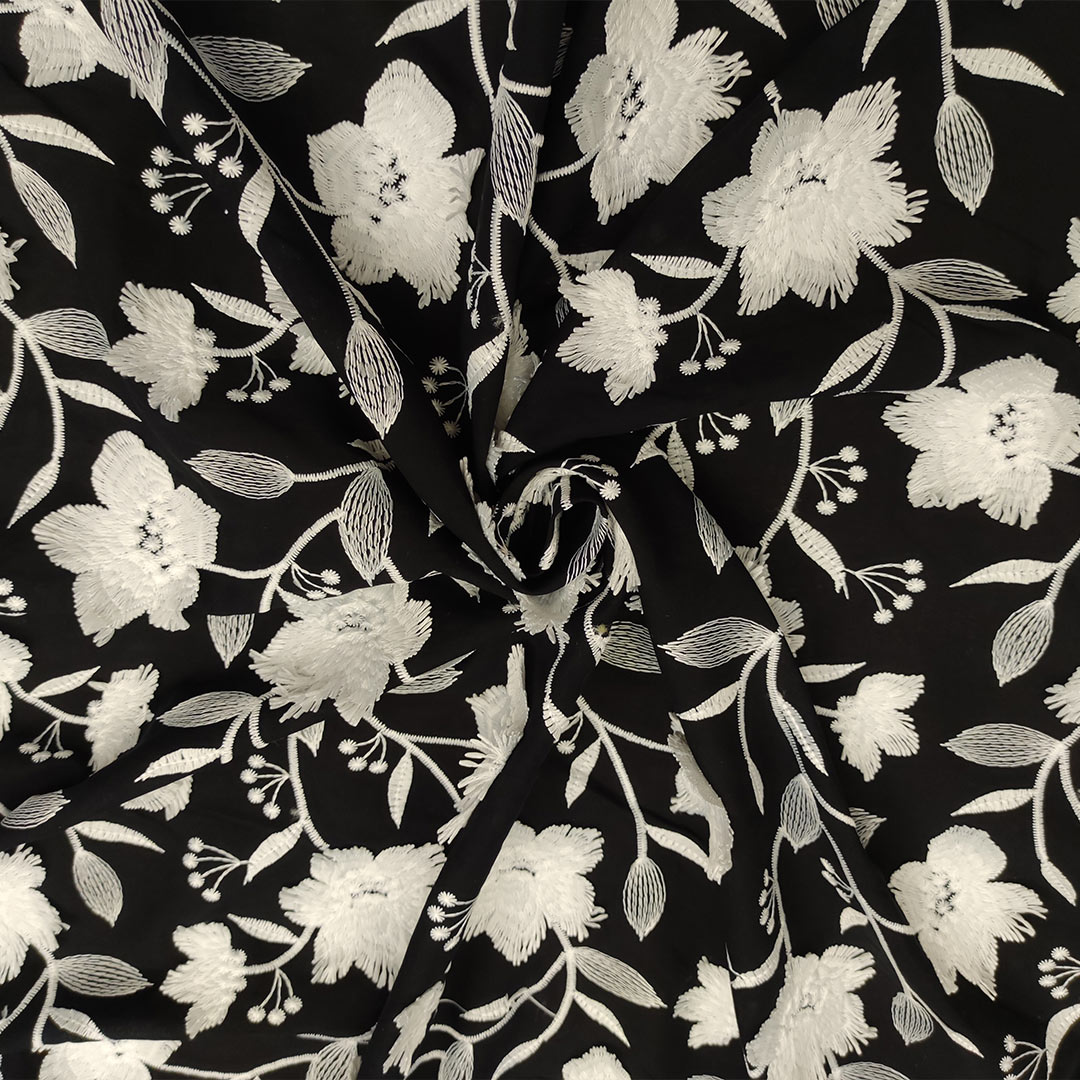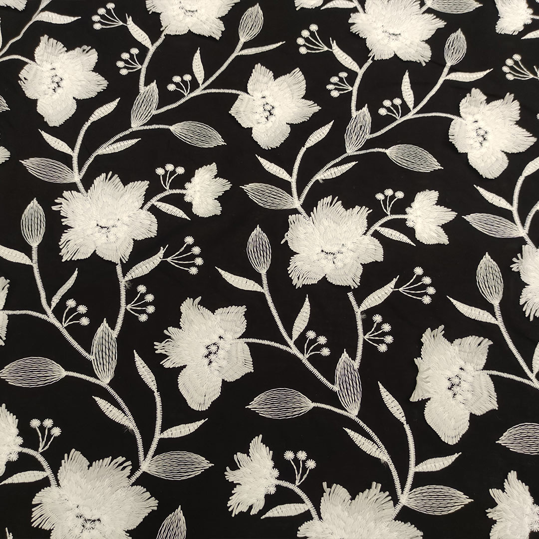 Tessuto Mussola di Cotone ricamato motivo floreale nero – bianco