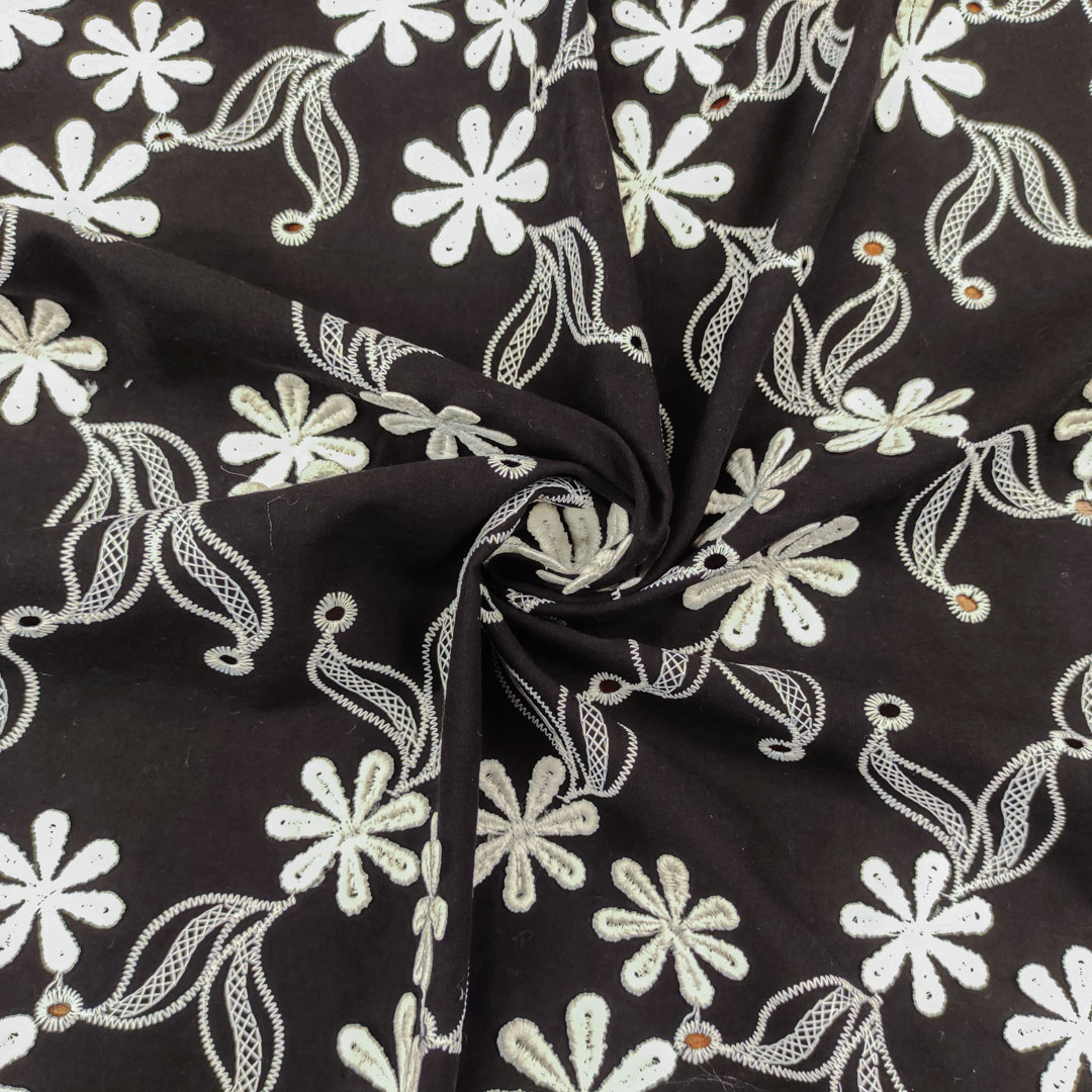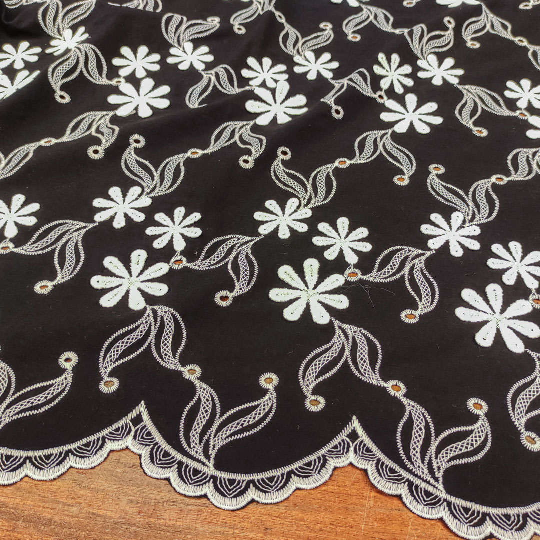 Tessuto Mussola di Cotone ricamato motivo floreale nero – bianco