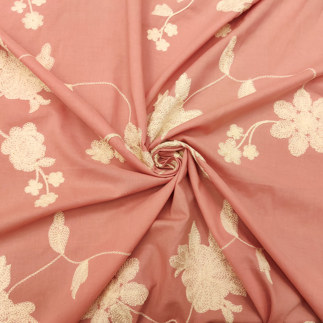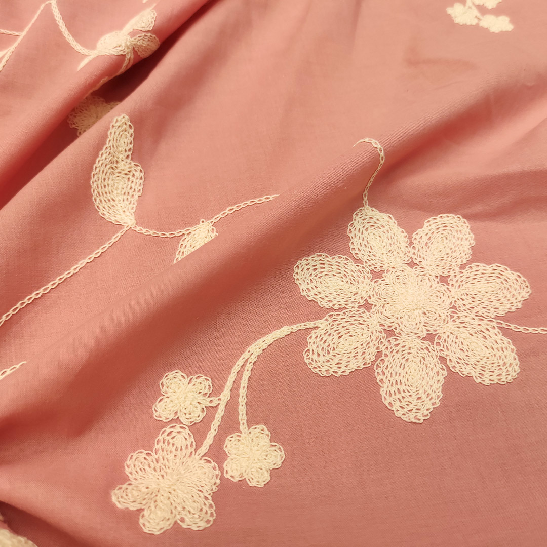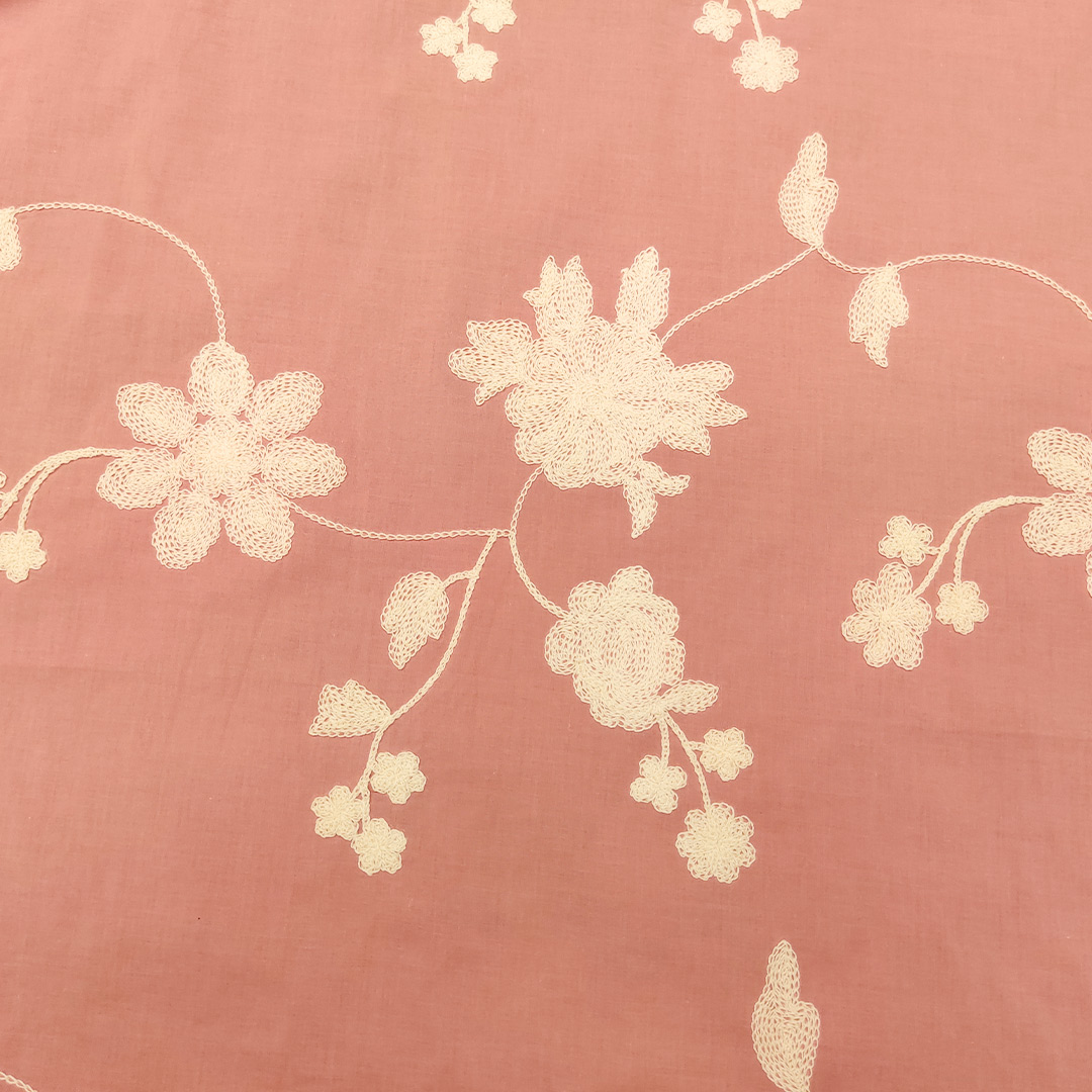 Tessuto Mussola di Cotone ricamato motivo floreale rosa antico – panna