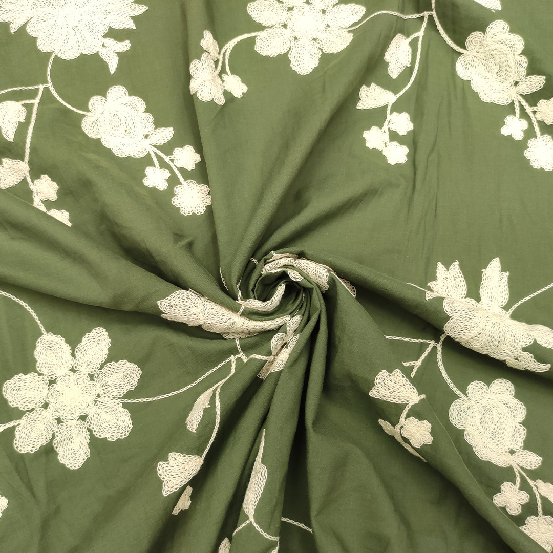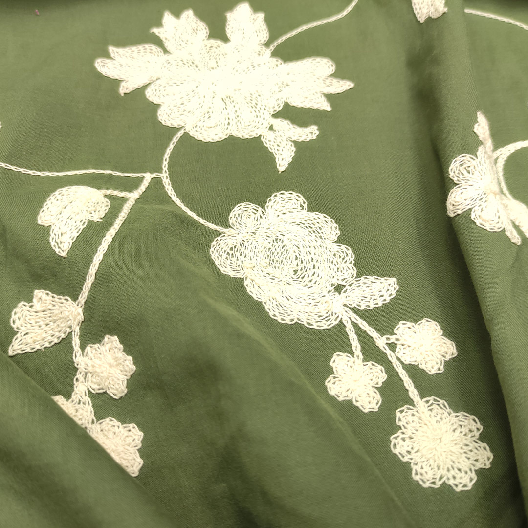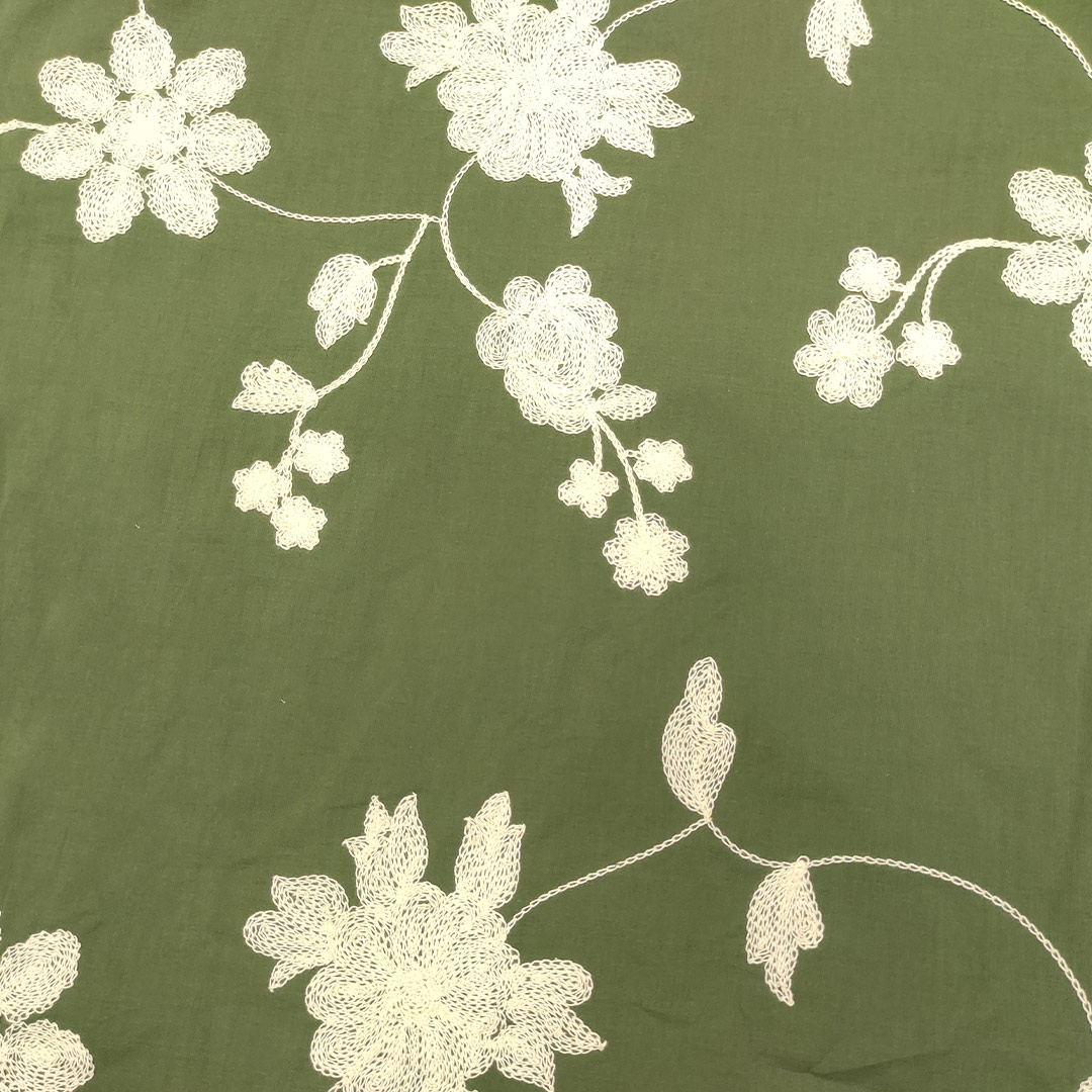 Tessuto Mussola di Cotone ricamato motivo floreale verde militare – panna
