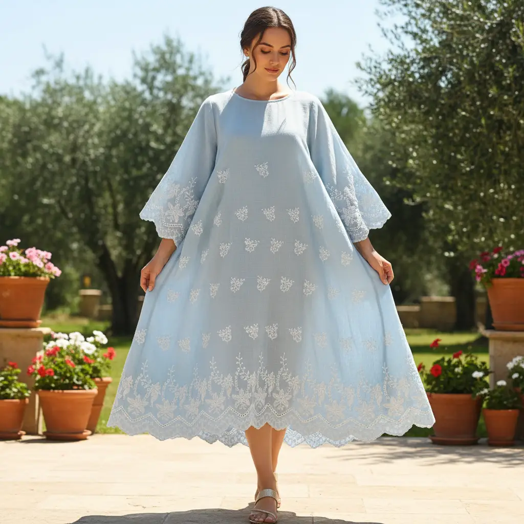 Tessuto Mussola ricamato dalla mano leggera e fresca, ideale per realizzare capi comodi e freschi come: abiti, gonne, pantaloni e camicie.
