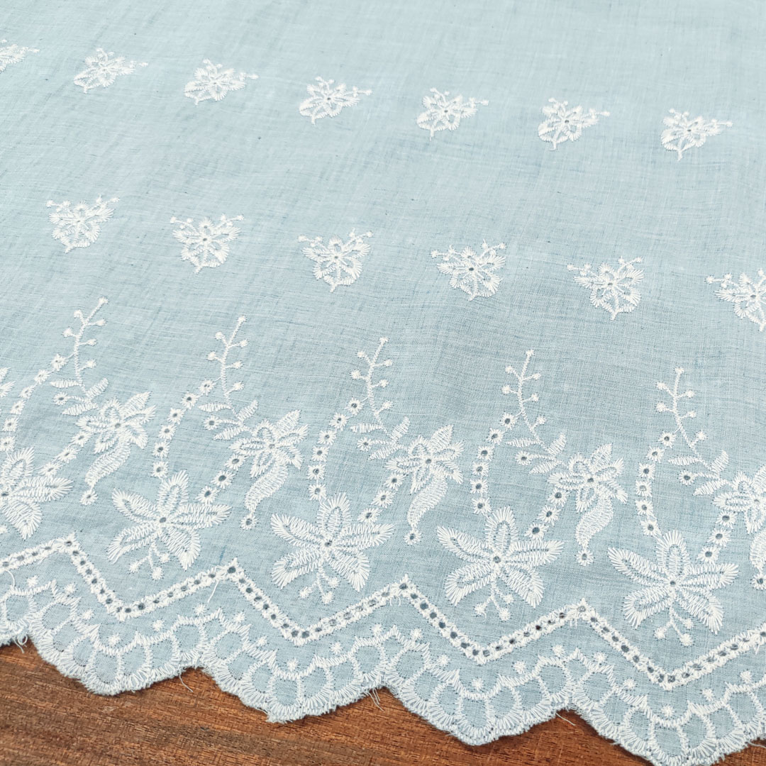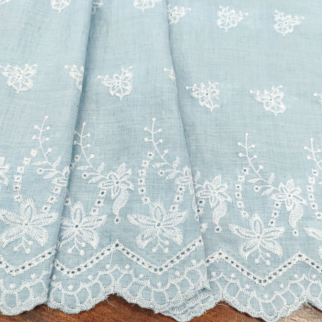 Tessuto Mussola di Cotone ricamato su un solo bordo motivo floreale celeste – bianco