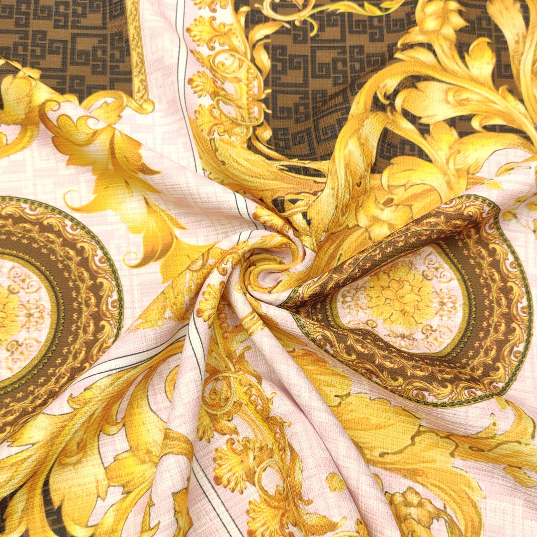 Tessuto Piquet di cotone a fantasia motivo floreale barocco rosa – oro – marrone