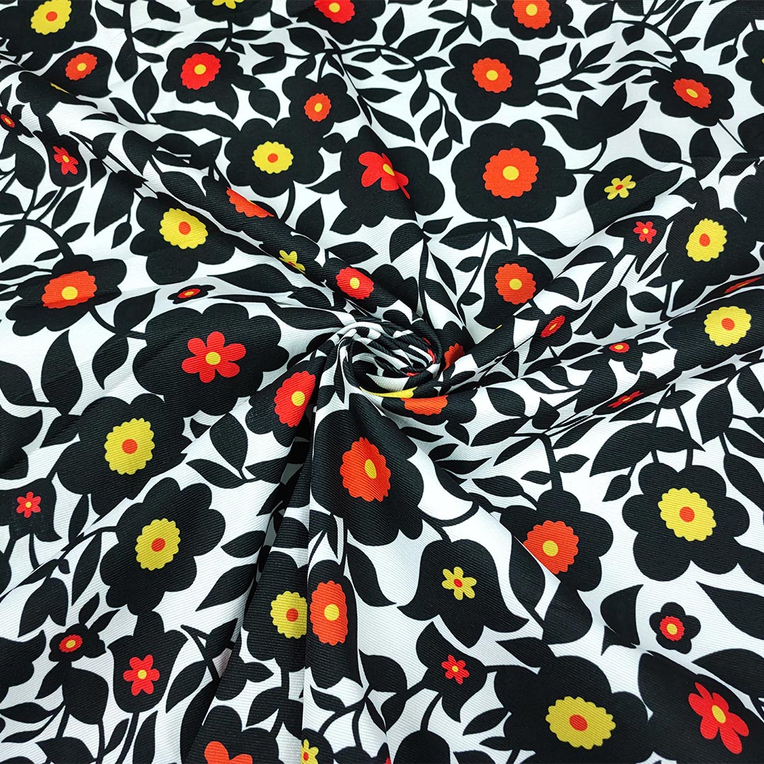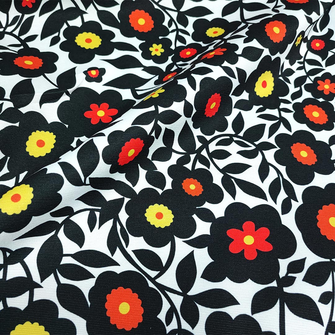 Tessuto Piquet di cotone a fantasia motivo floreale bianco – nero – arancione