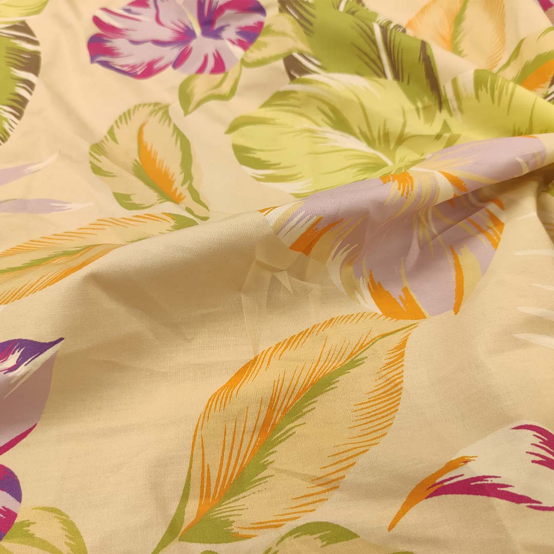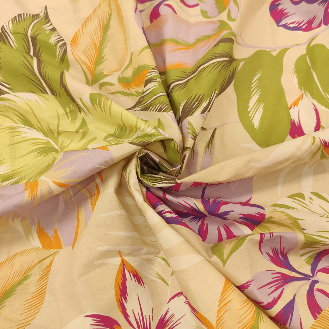 Tessuto Popeline di cotone a fantasia motivo beige – verde acido – lilla