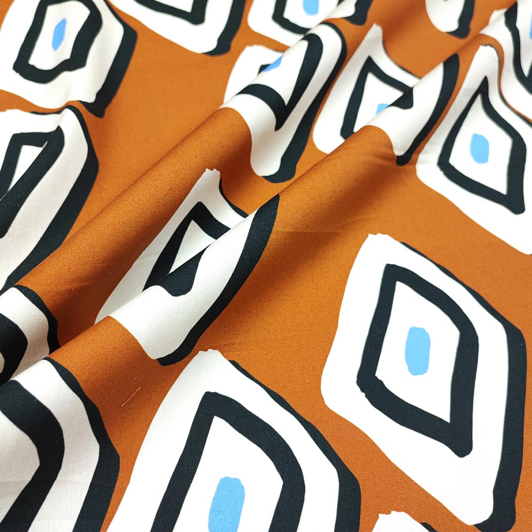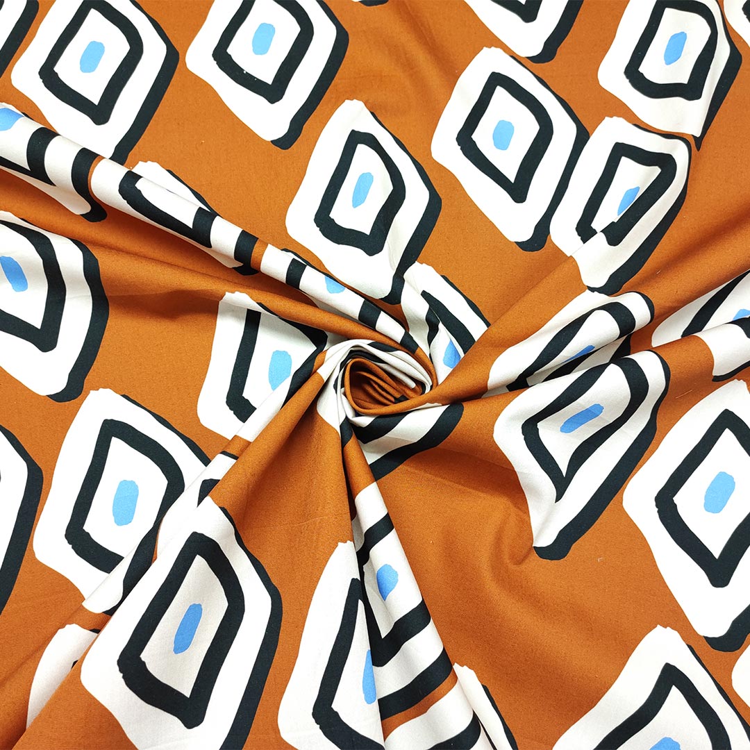 Tessuto Popeline di cotone a fantasia motivo geometrico ruggine – celeste – bianco