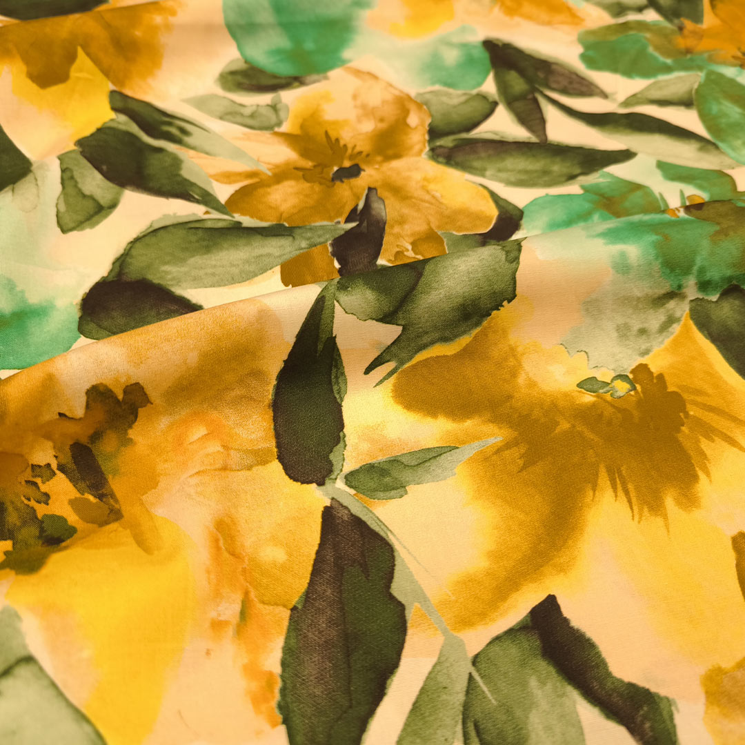 Tessuto Popeline di cotone elasticizzato a fantasia motivo floreale panna – giallo – verde