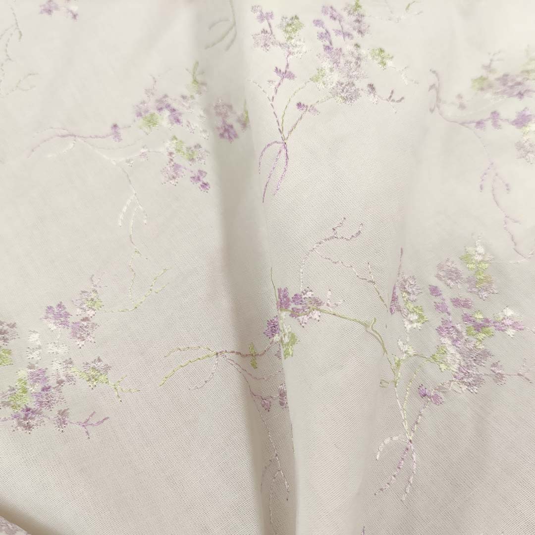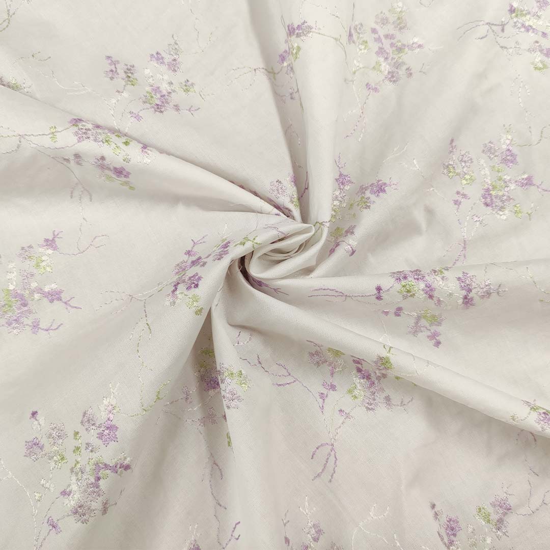 Tessuto Popeline di Cotone ricamato motivo floreale bianco – verdino – lilla