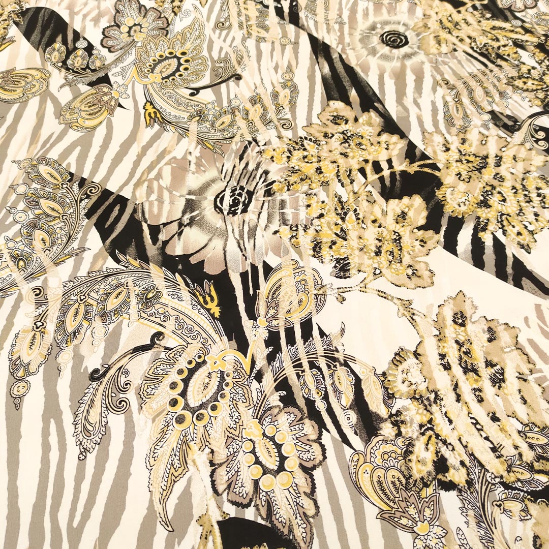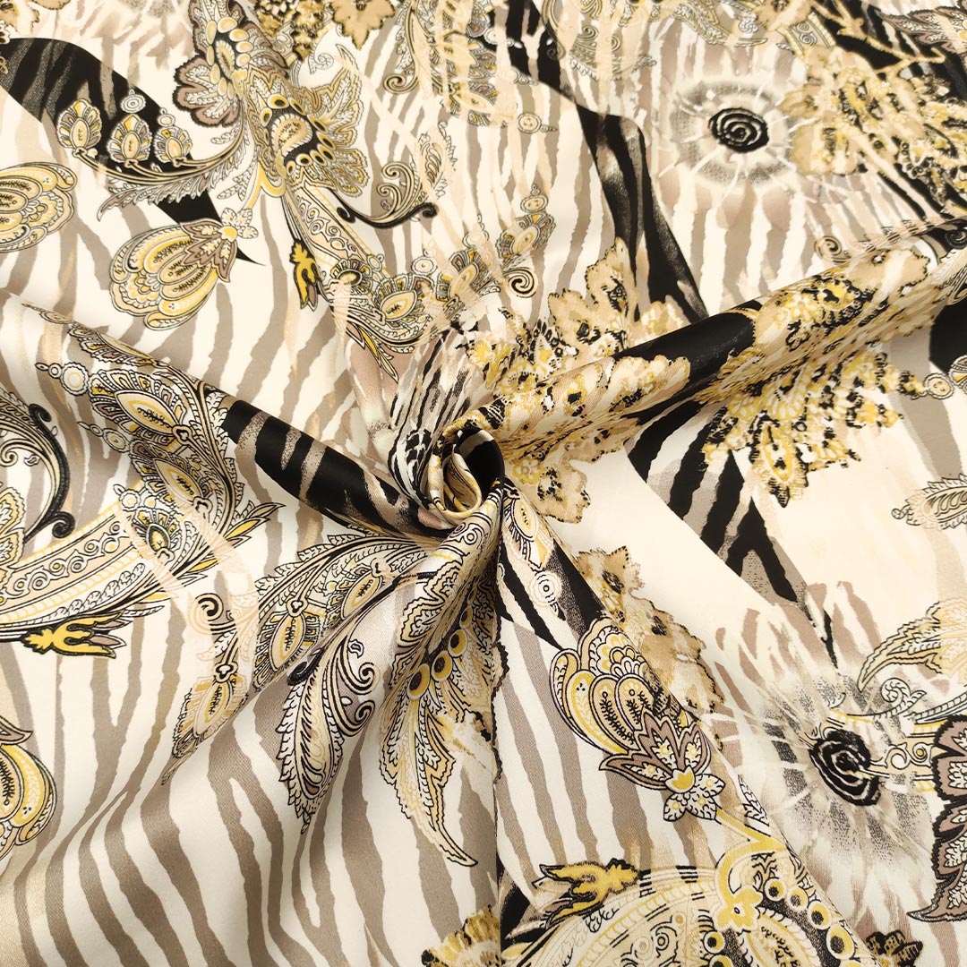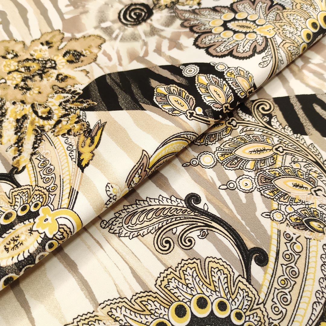 Tessuto Rasatello di cotone a fantasia motivo astratto beige – oro – nero – bianco