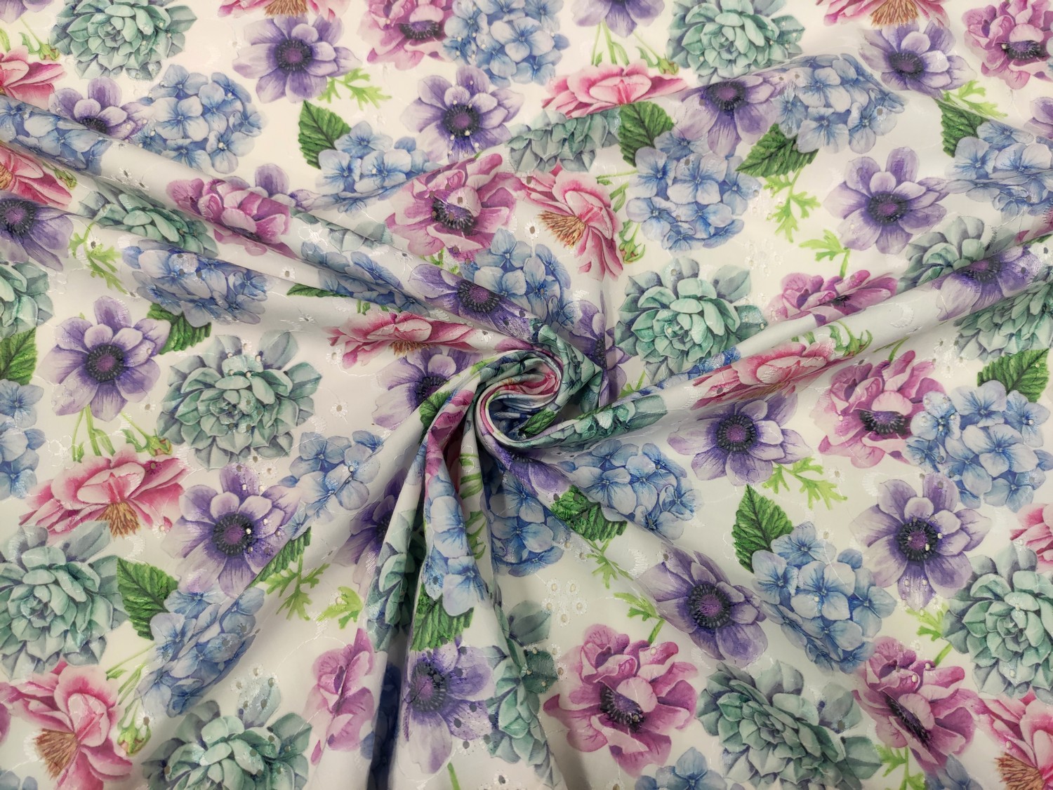 Tessuto Sangallo a fantasia dalla mano morbida e leggera, smerlato ambo i lati, ideale per realizzare capi colorati e freschi come: abiti, gonne, pantaloni e camicie. Selezione Iaia Collection