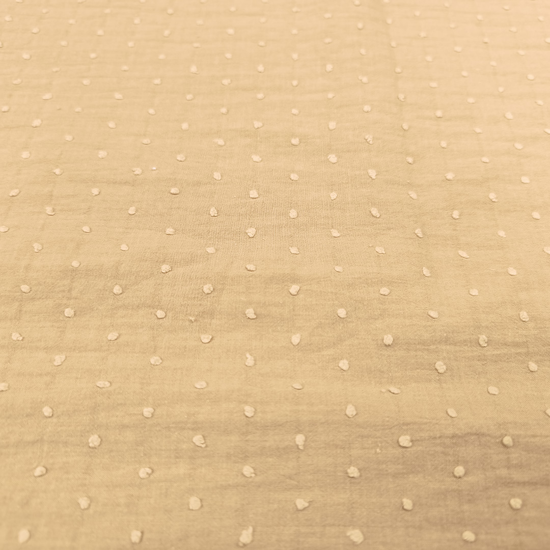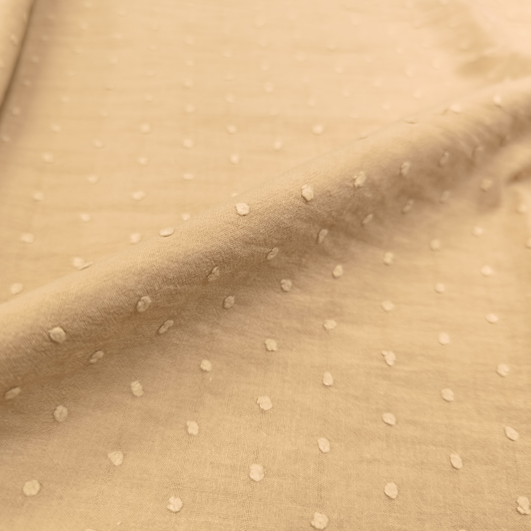 Tessuto Plumetis puro cotone tinta unita dalla mano morbida e fresca, con inserti ricamati a pois a rilievo tipici della lavorazione Plumetis, si presta alla creazione di capi adatti per la stagione estiva come: camicie, abiti e gonne.