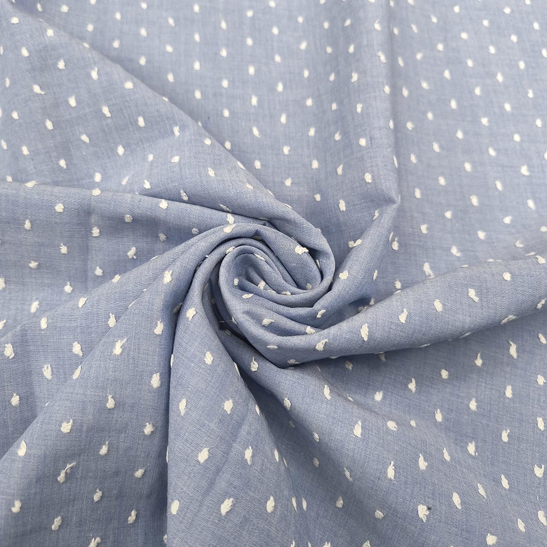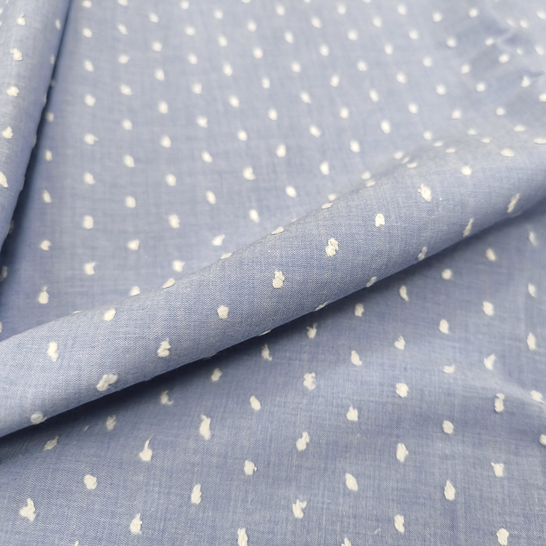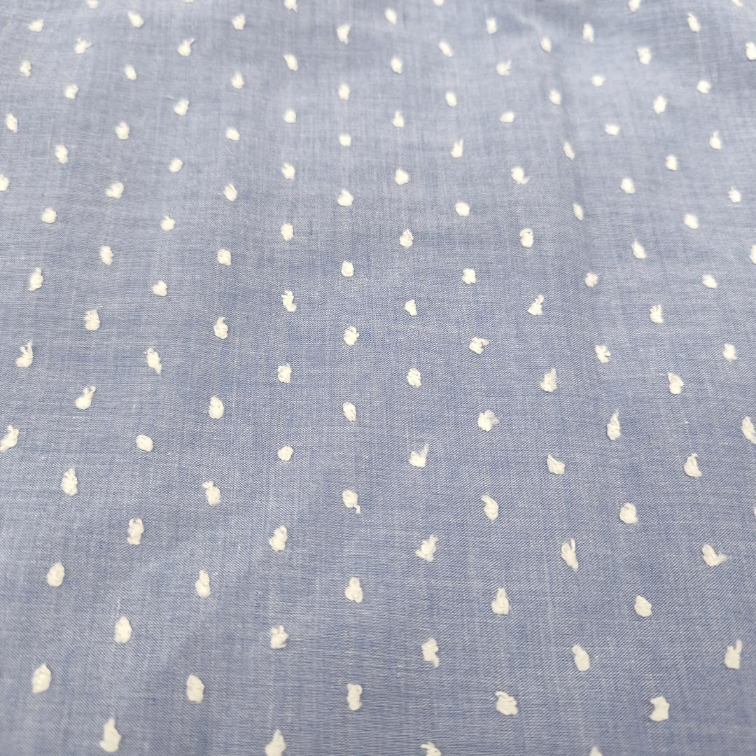 Tessuto Plumetis puro cotone tinta unita dalla mano morbida e fresca, con inserti ricamati a pois a rilievo tipici della lavorazione Plumetis, si presta alla creazione di capi adatti per la stagione estiva come: camicie, abiti e gonne.