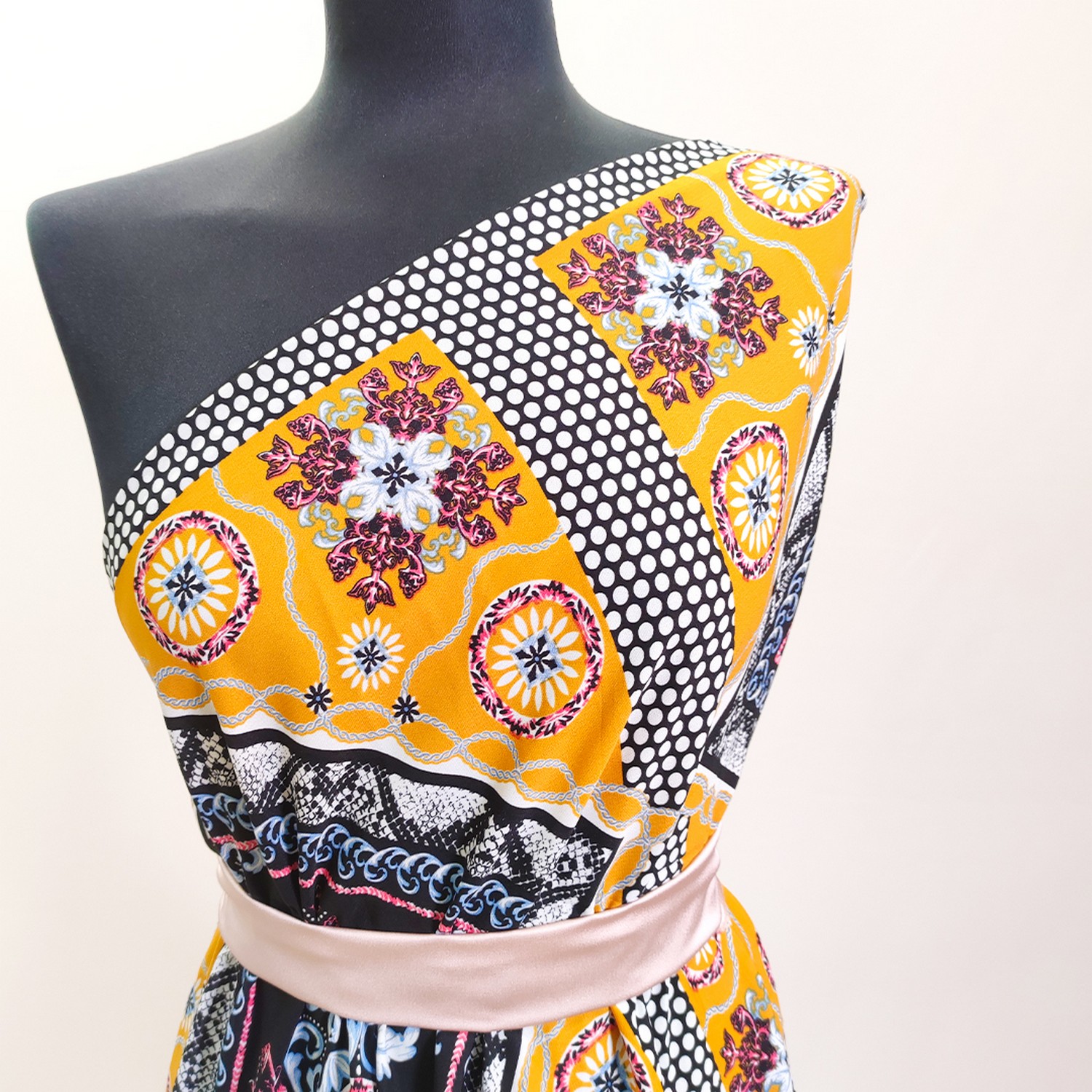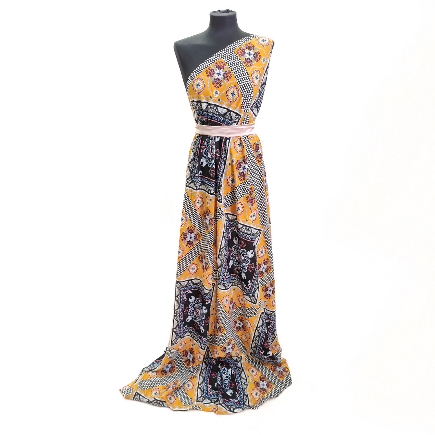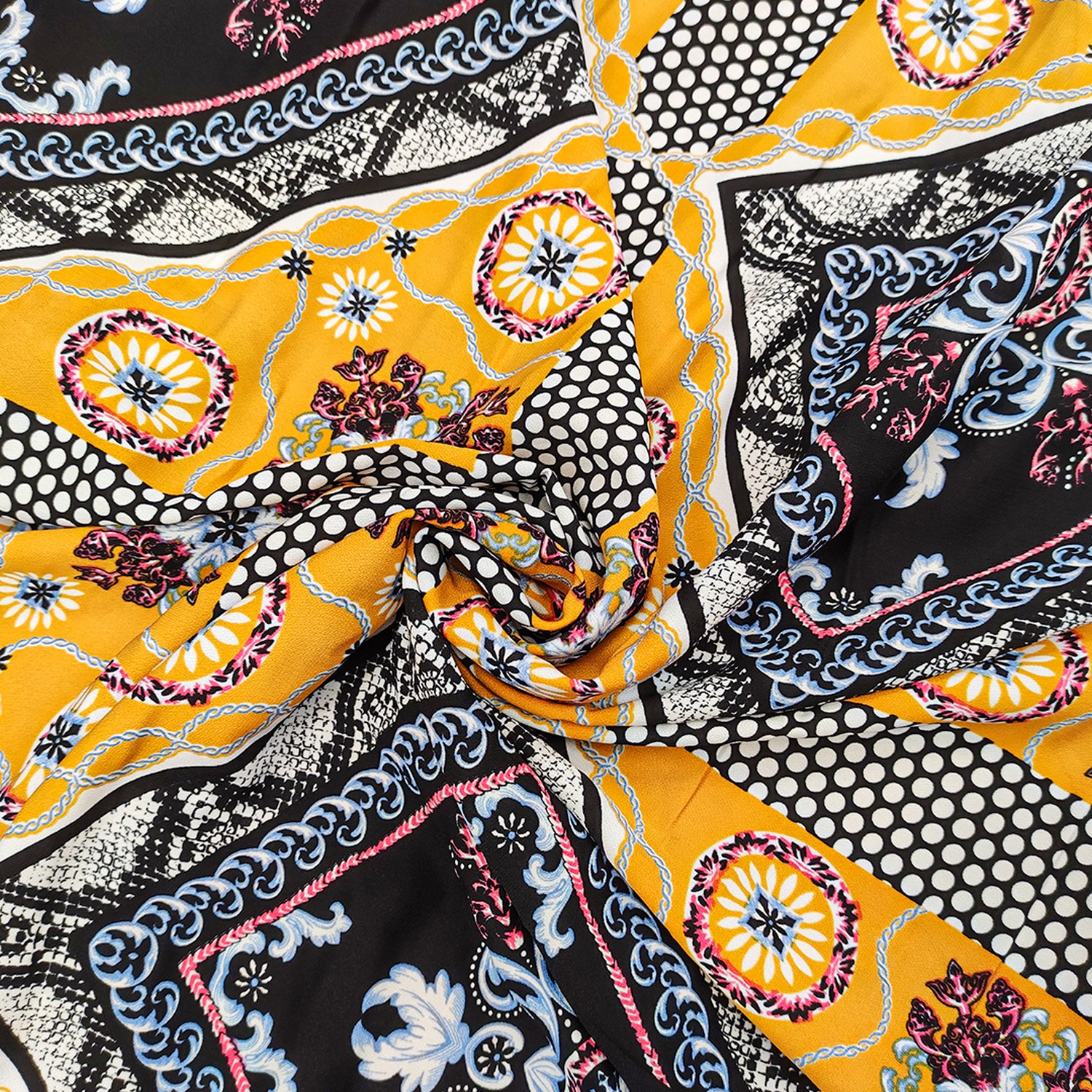 Tessuto Crepe a fantasia dalla mano rugosa, leggera e morbida, leggermente elasticizzato. Ideale per realizzare capi freschi e comodi come: abiti, camicie gonne e bluse.