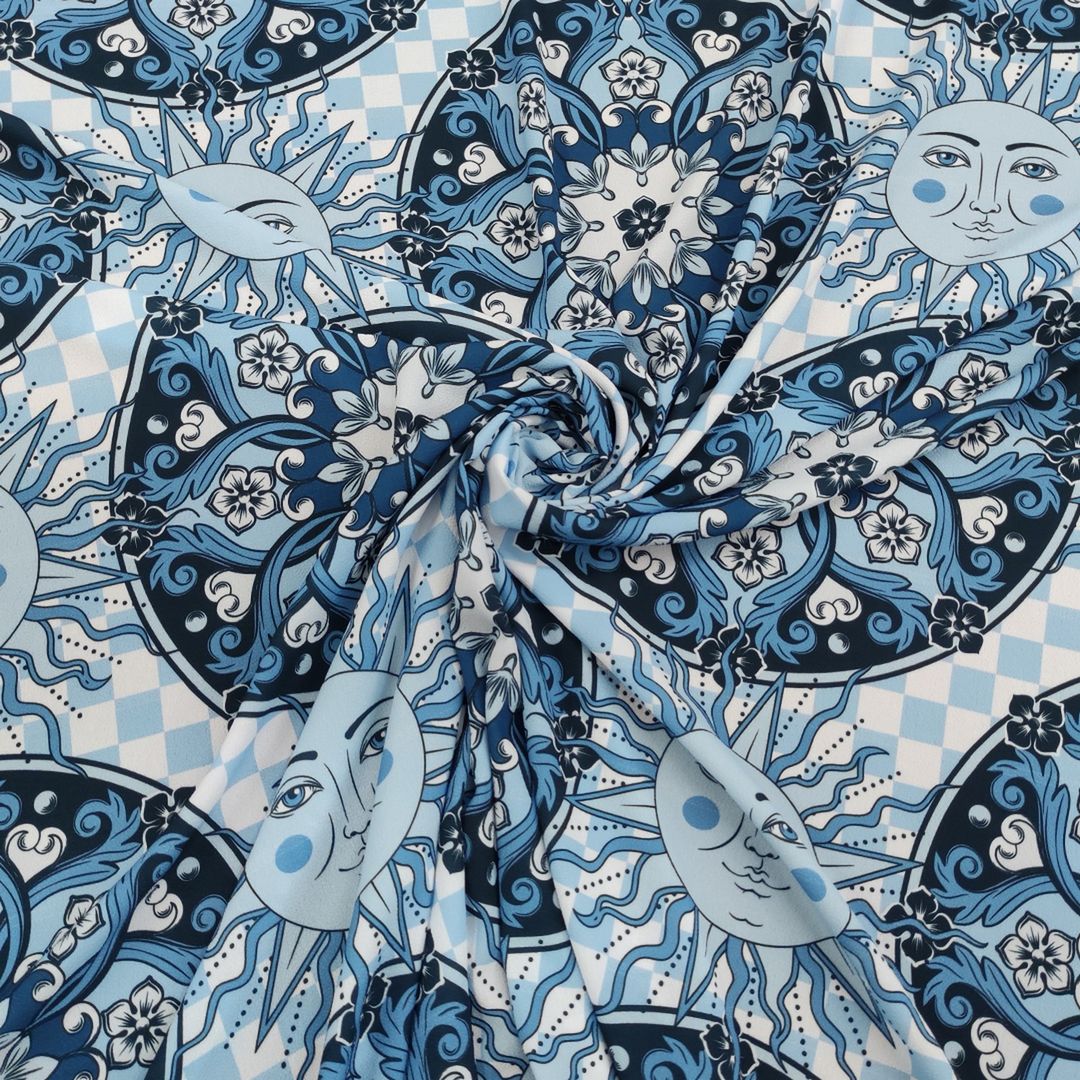 Tessuto Crepe a fantasia motivo floreale barocco celeste – blu – carta da zucchero
