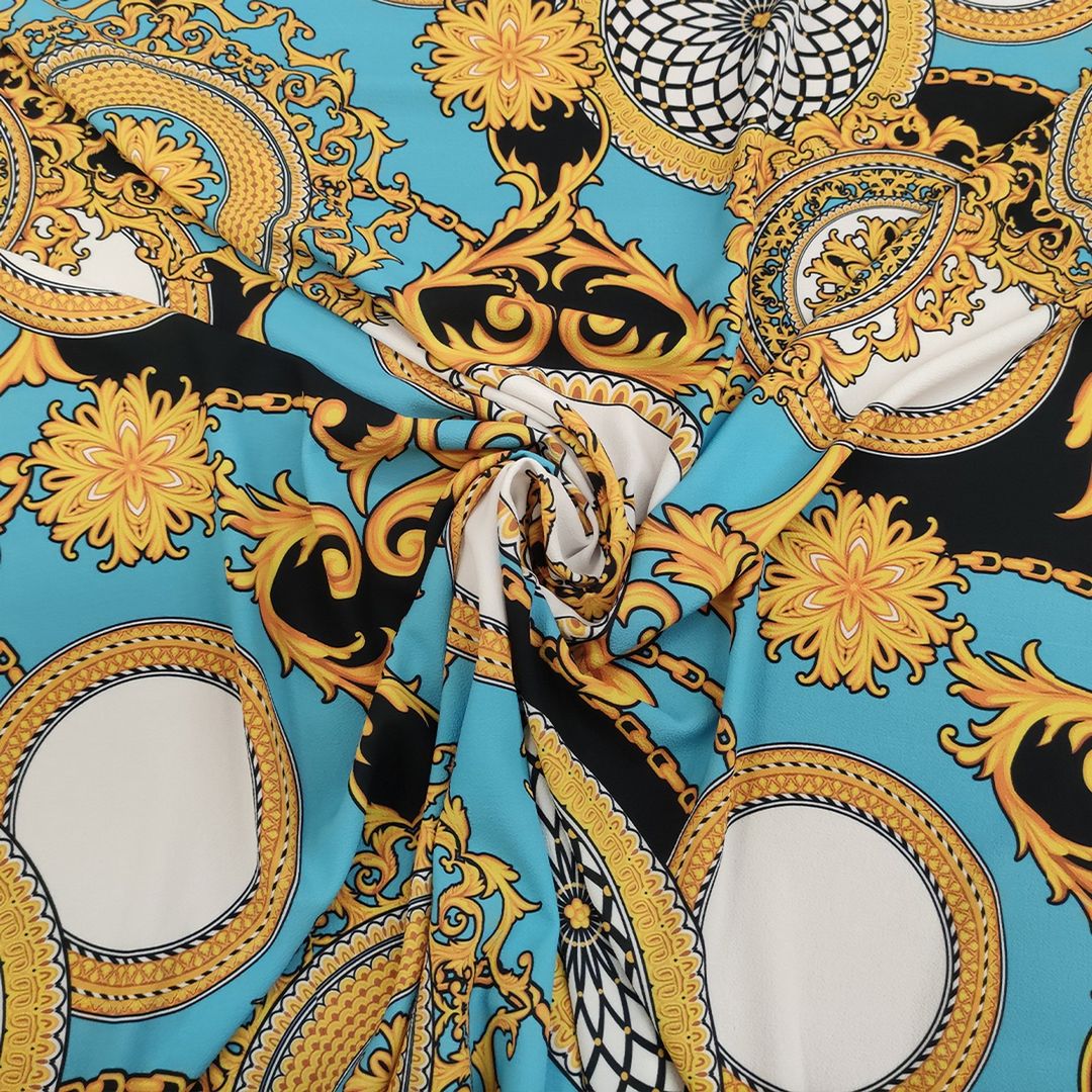 Tessuto Crepe a fantasia motivo floreale barocco celeste – ocra – nero