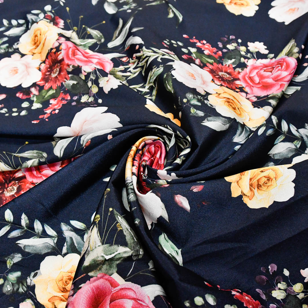 Tessuto Crepe a fantasia motivo floreale blu – rosa – giallo