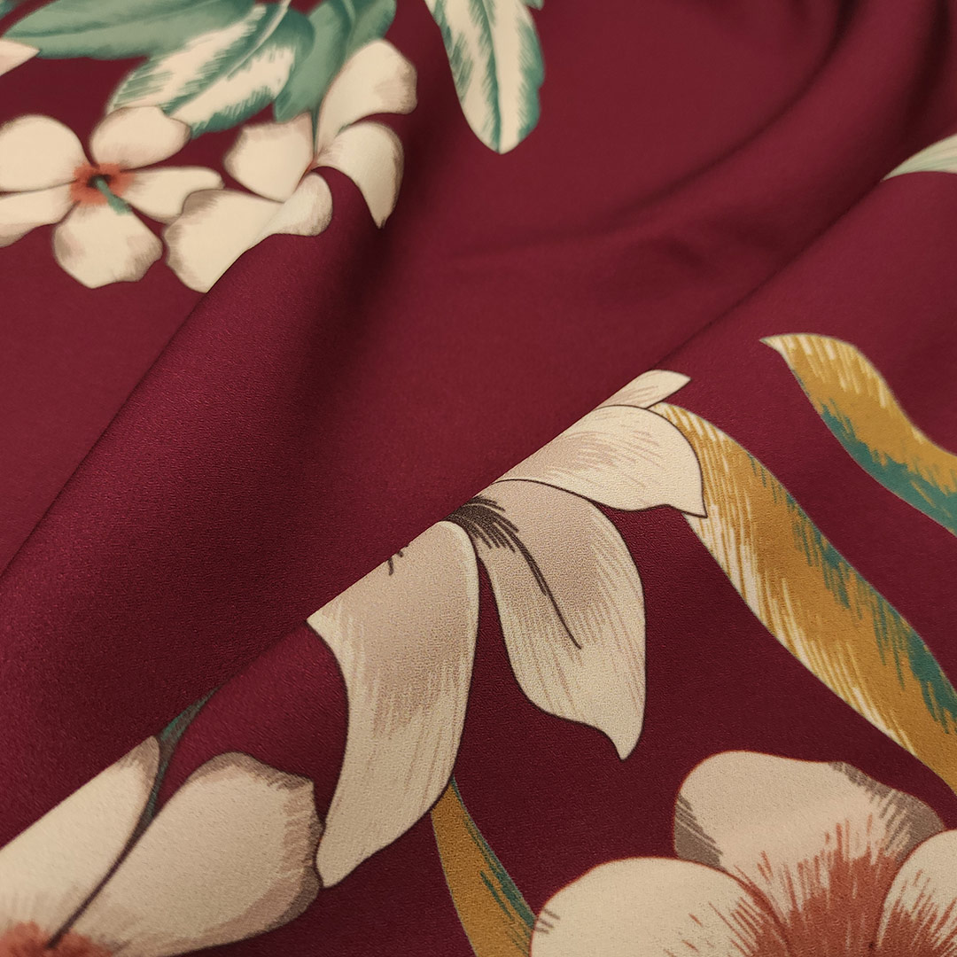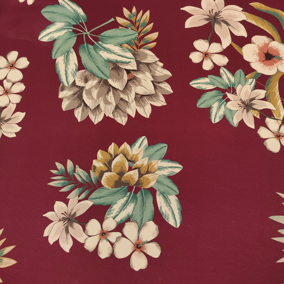 Tessuto Crepe a fantasia motivo floreale bordeaux – eucalipto – beige