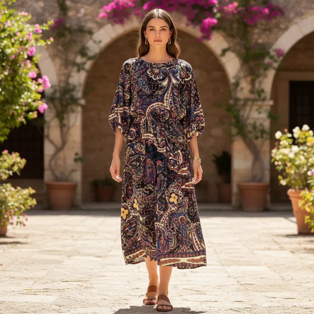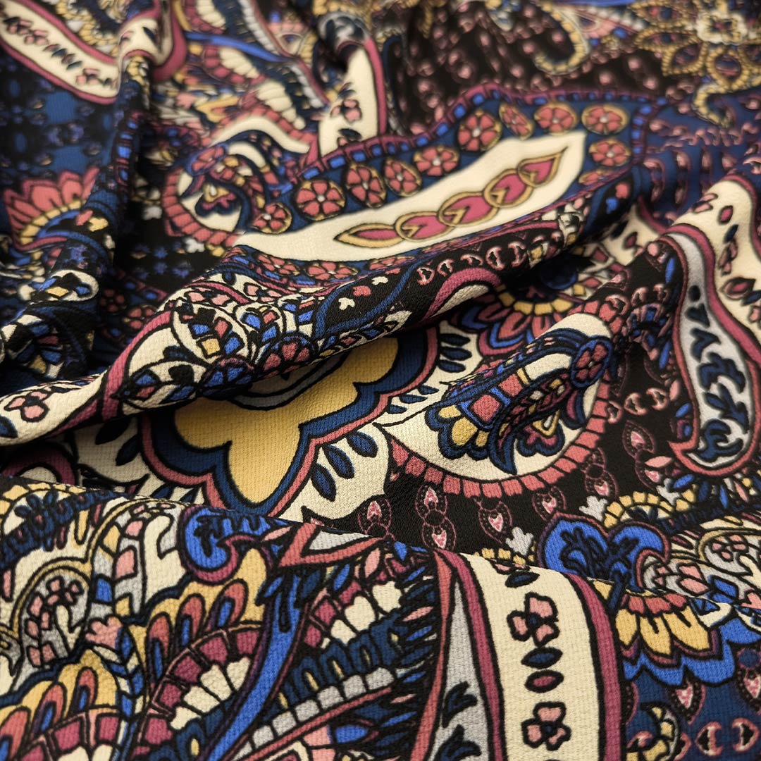 Tessuto Crepe a fantasia dalla mano rugosa, leggera e morbida, leggermente elasticizzato. Ideale per realizzare capi freschi e comodi come: abiti, camicie gonne e bluse.