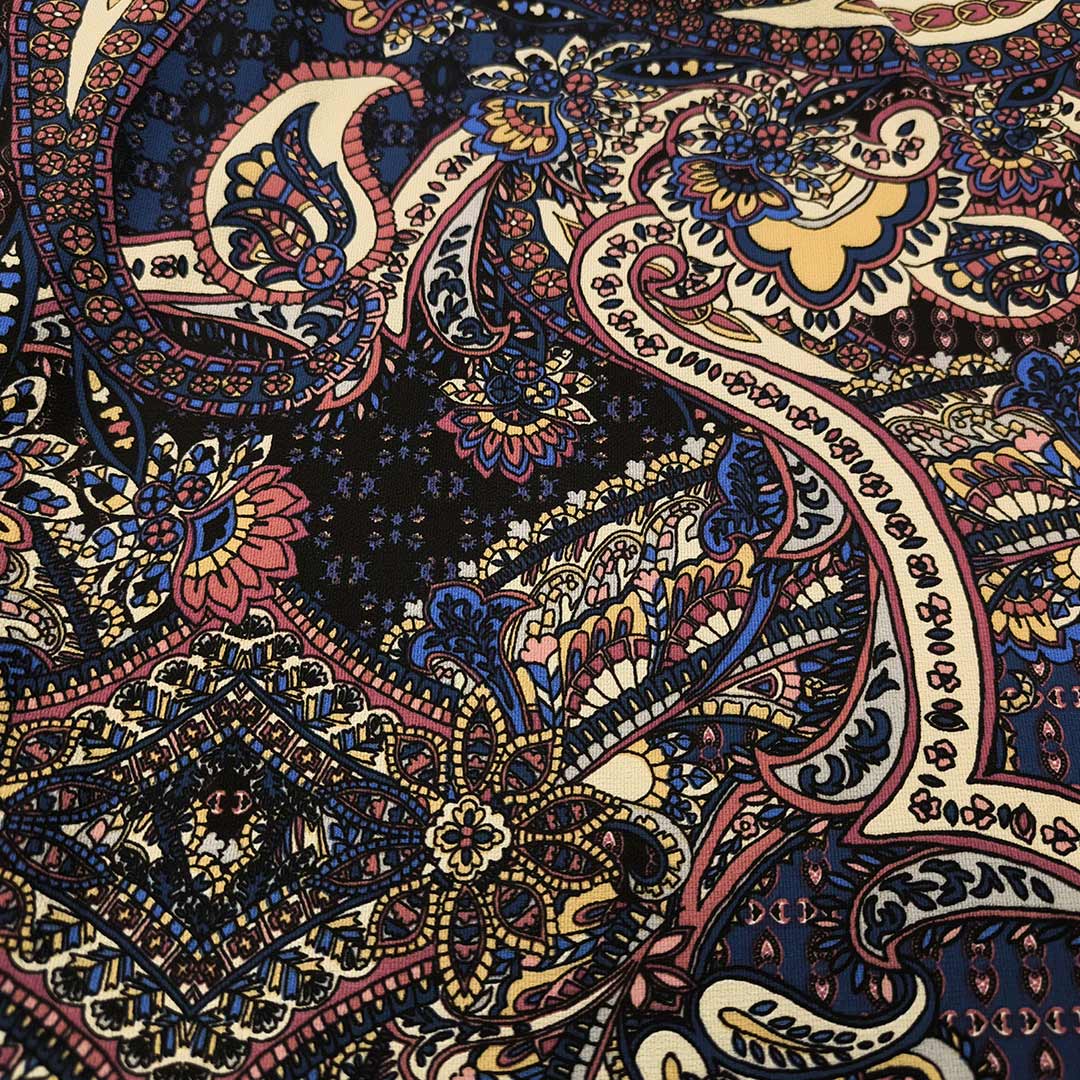 Tessuto Crepe a fantasia motivo floreale cashmere blu – bordeaux – panna