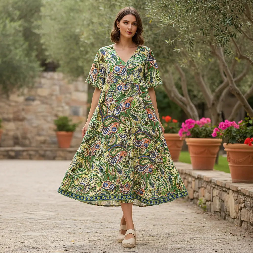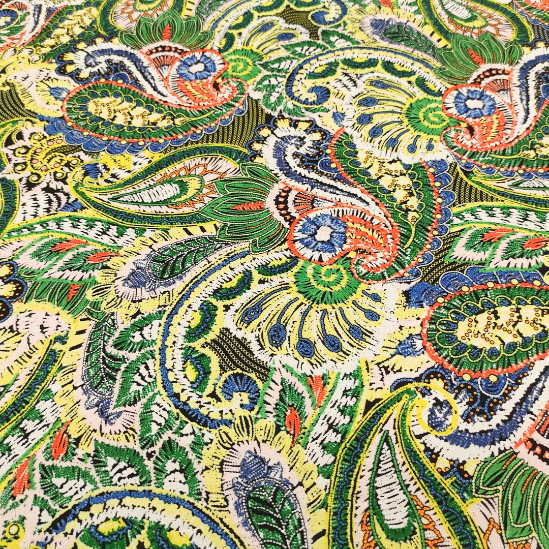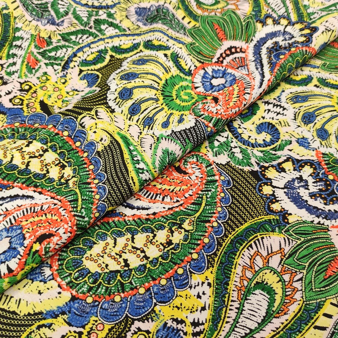Tessuto Crepe a fantasia motivo floreale cashmere verde – giallo – bluette