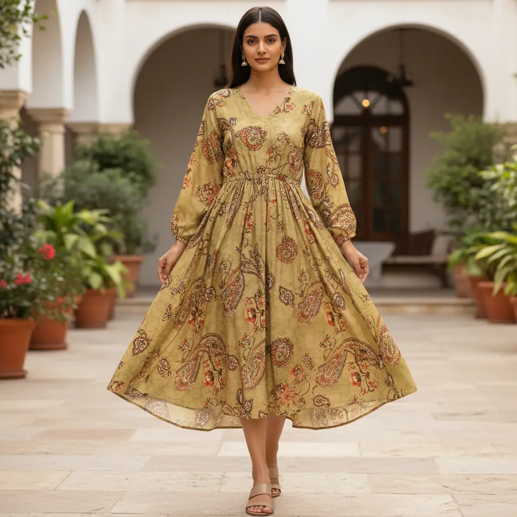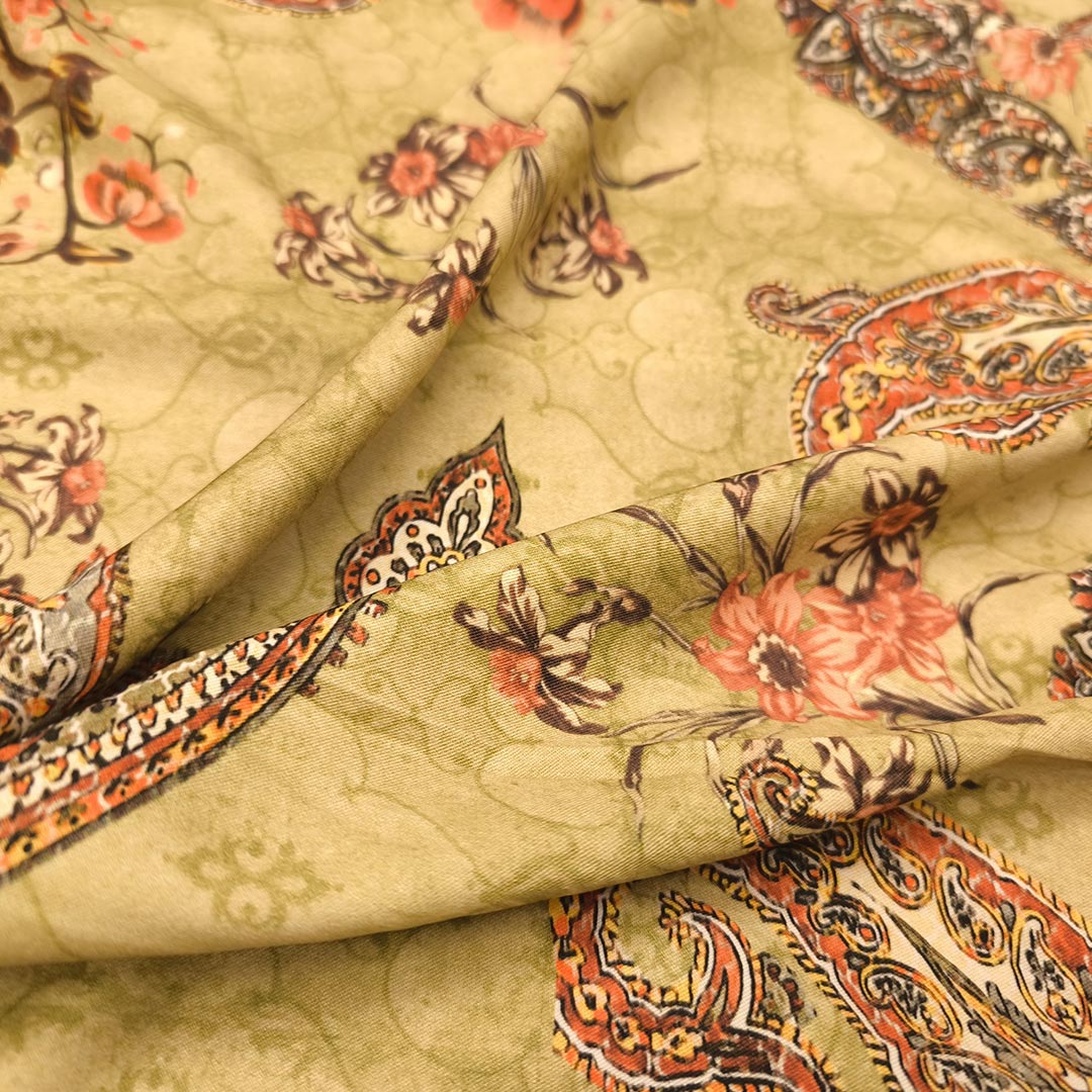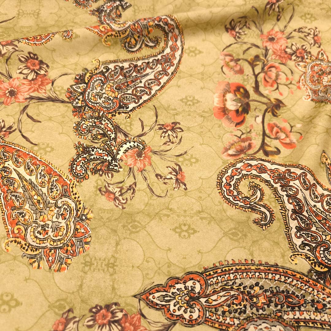 Tessuto Crepe a fantasia motivo floreale cashmere verde oliva – ruggine
