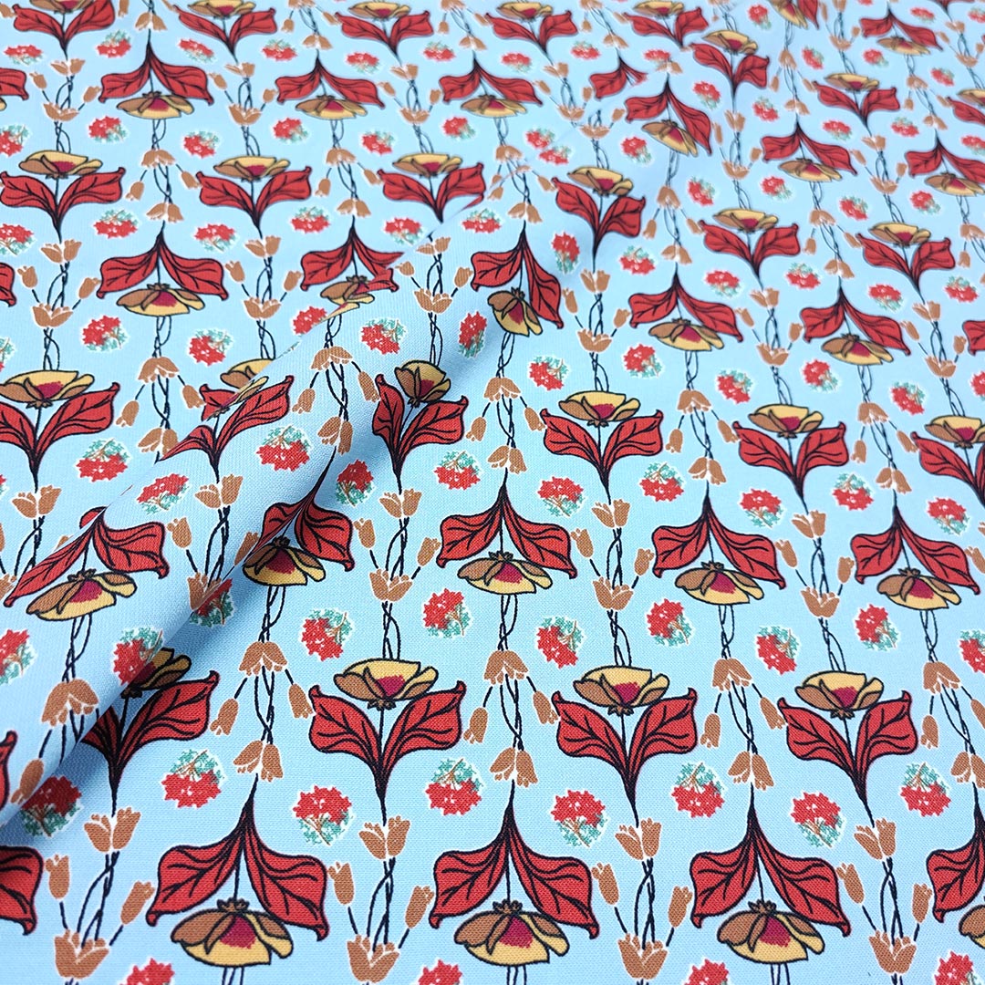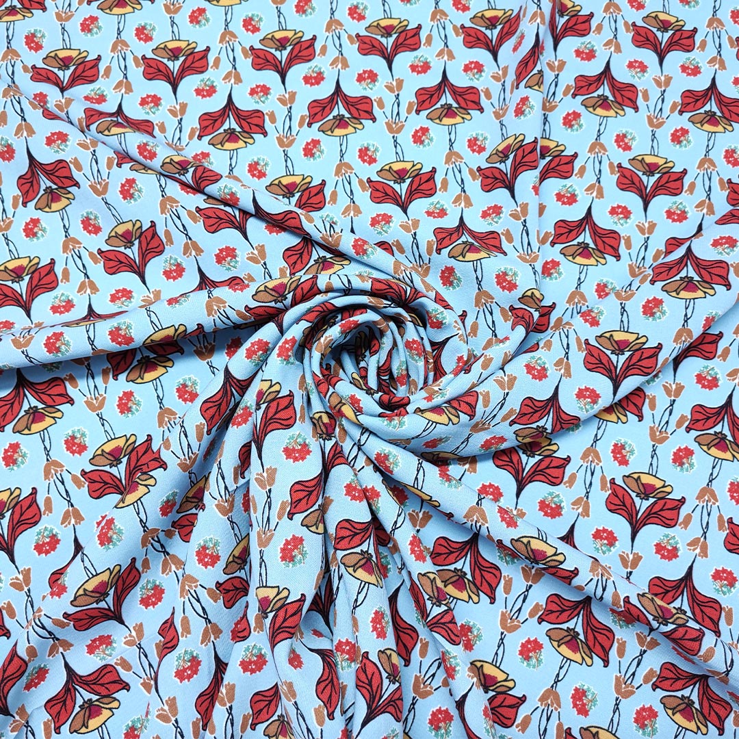 Tessuto Crepe a fantasia motivo floreale celeste – rosso – ocra