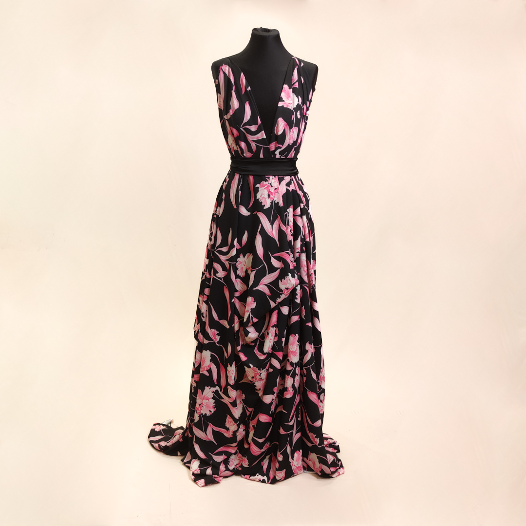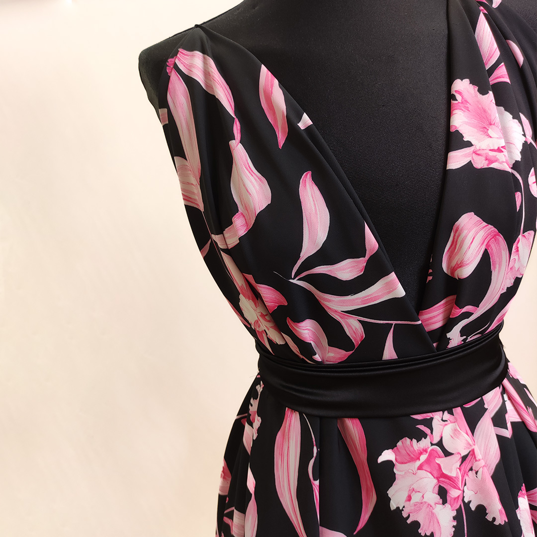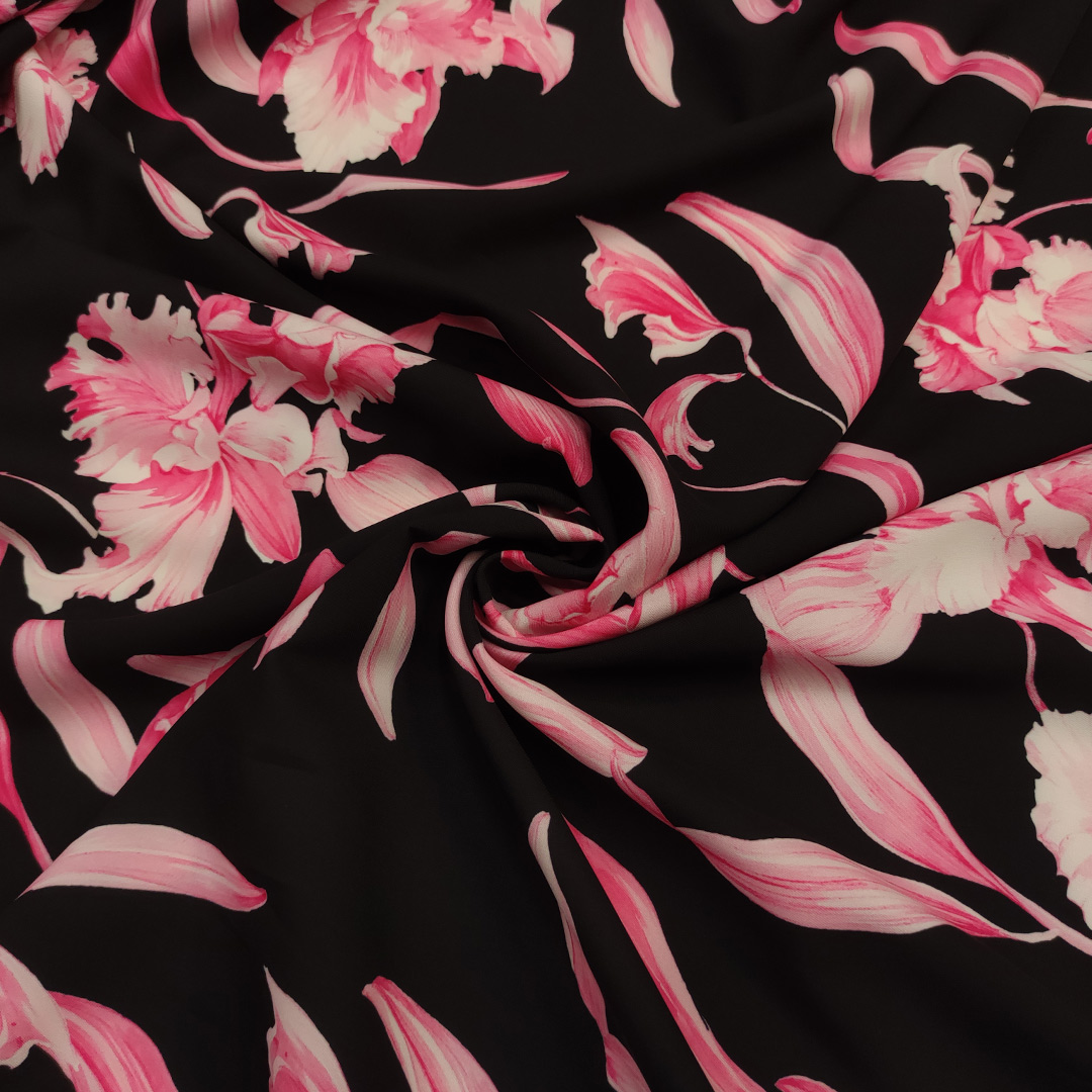 Tessuto Crepe a fantasia motivo floreale nero – fucsia