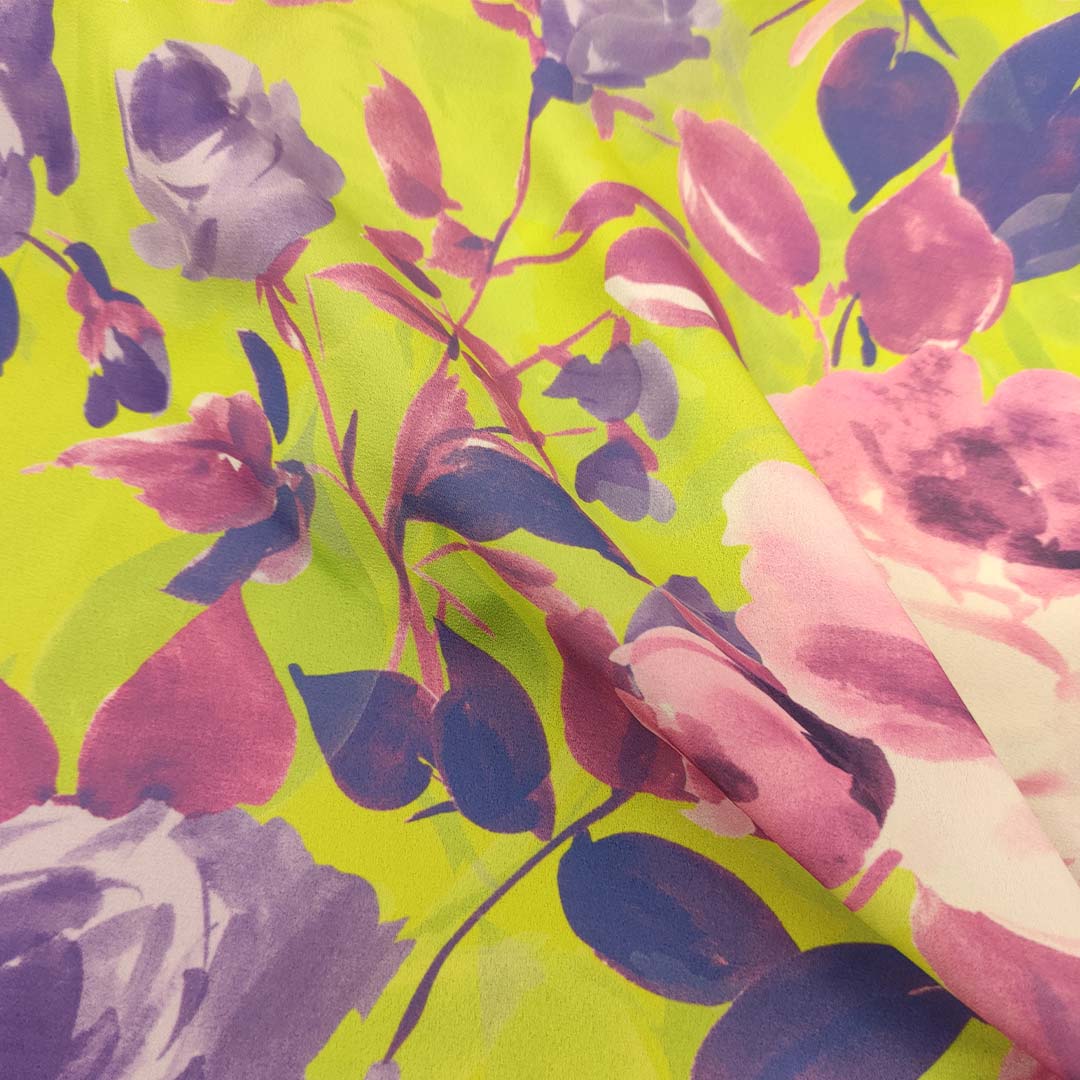 Tessuto Crepe a fantasia motivo floreale verde fluo – viola – rosa