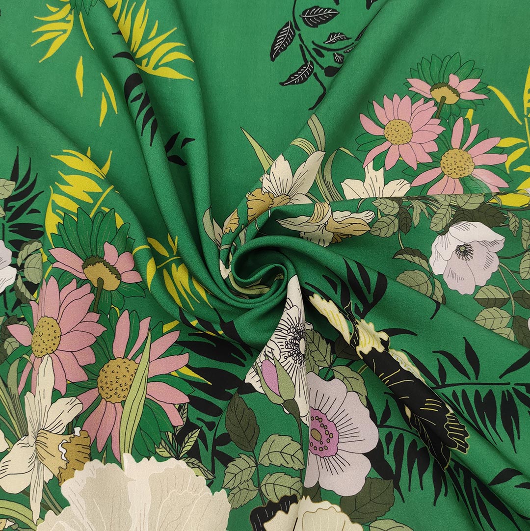 Tessuto Crepe a fantasia motivo floreale verde – giallo – rosa