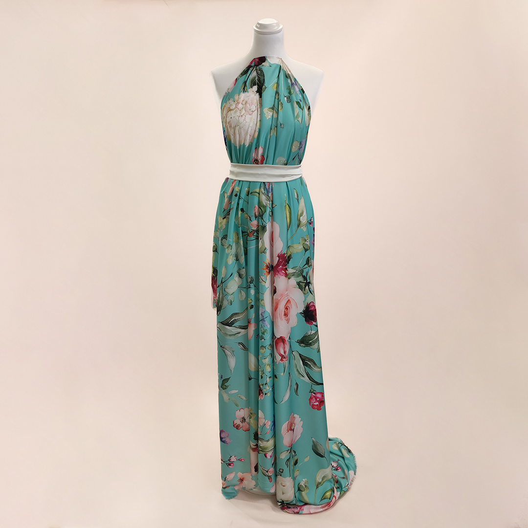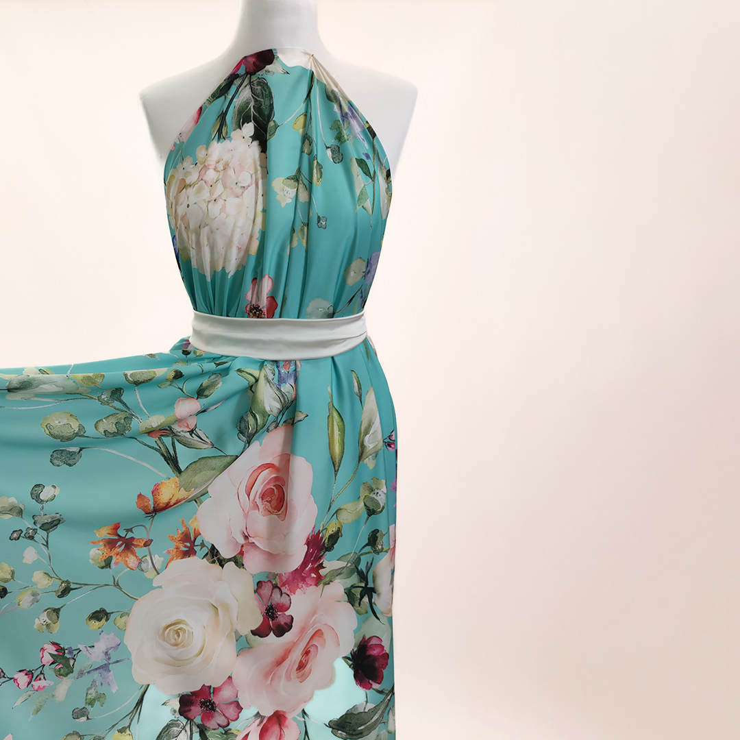 Tessuto Crepe a fantasia motivo floreale verde tiffany – bianco – rosa