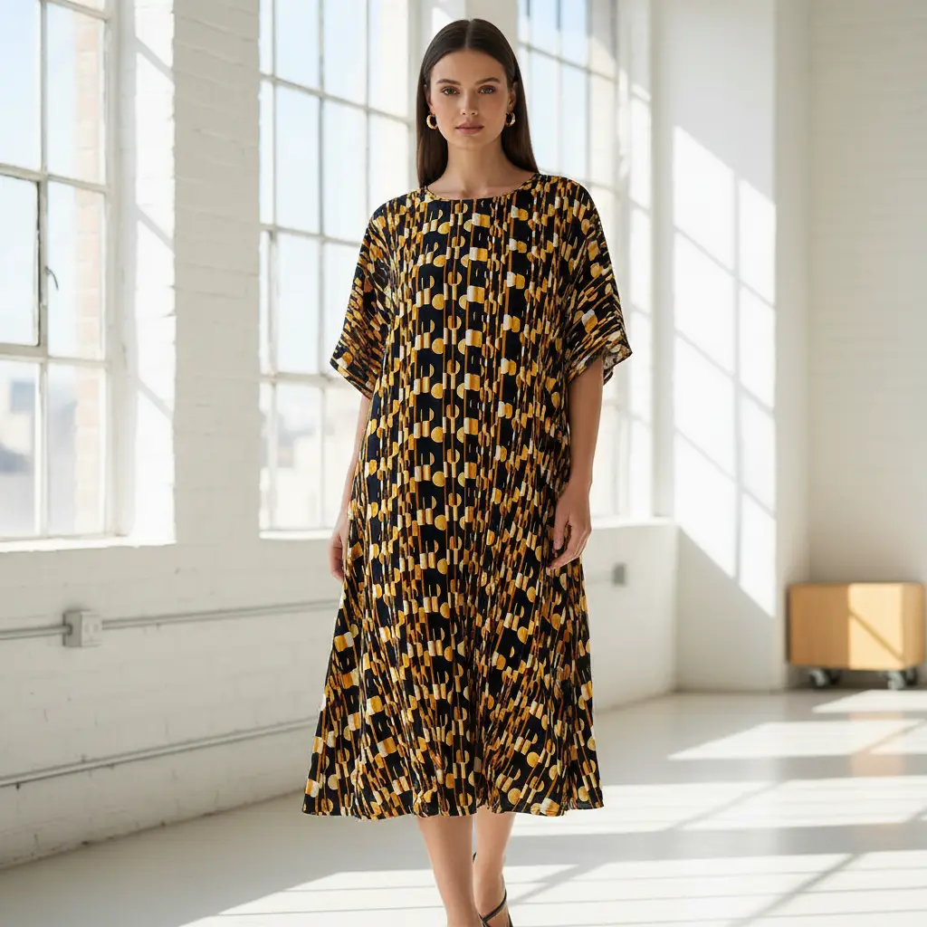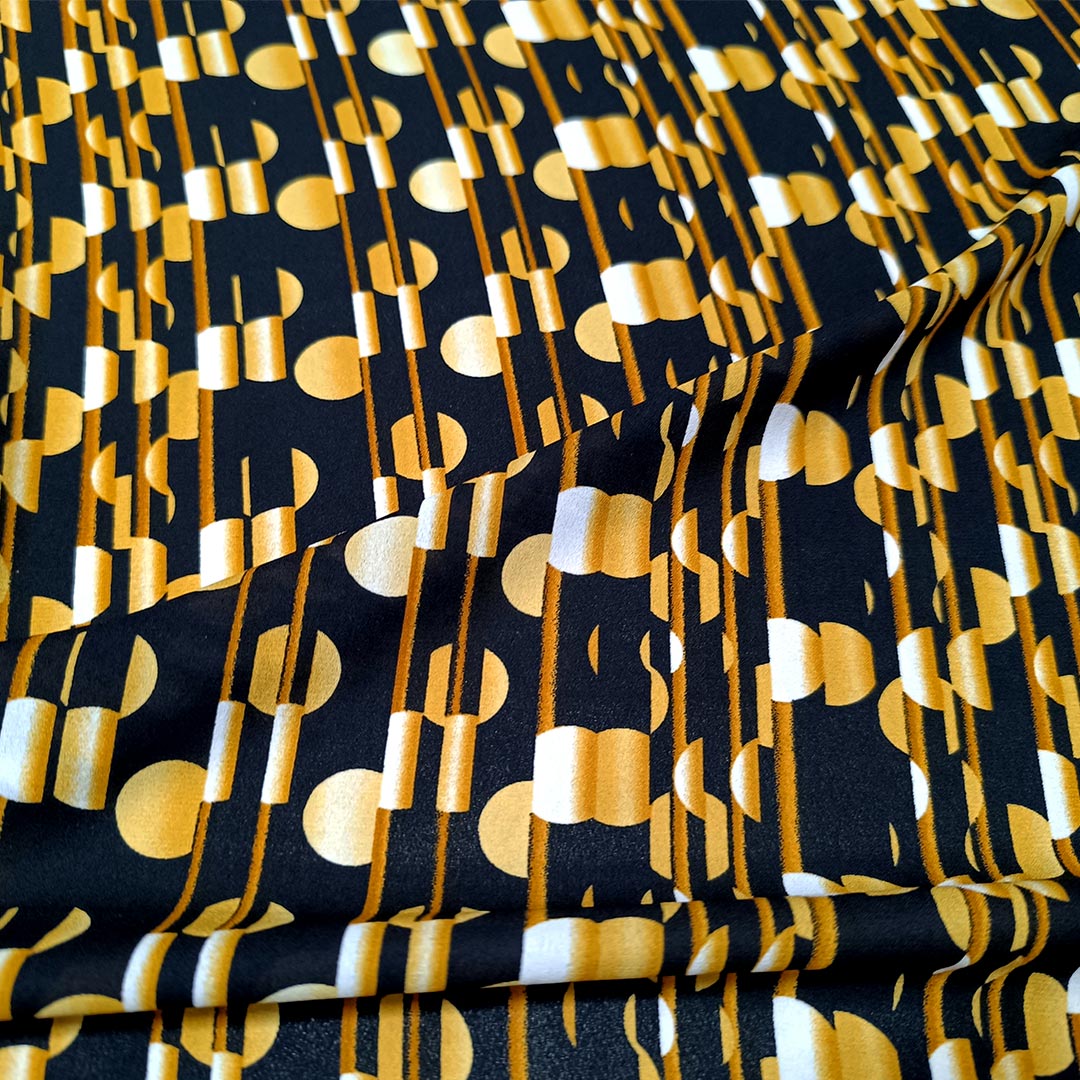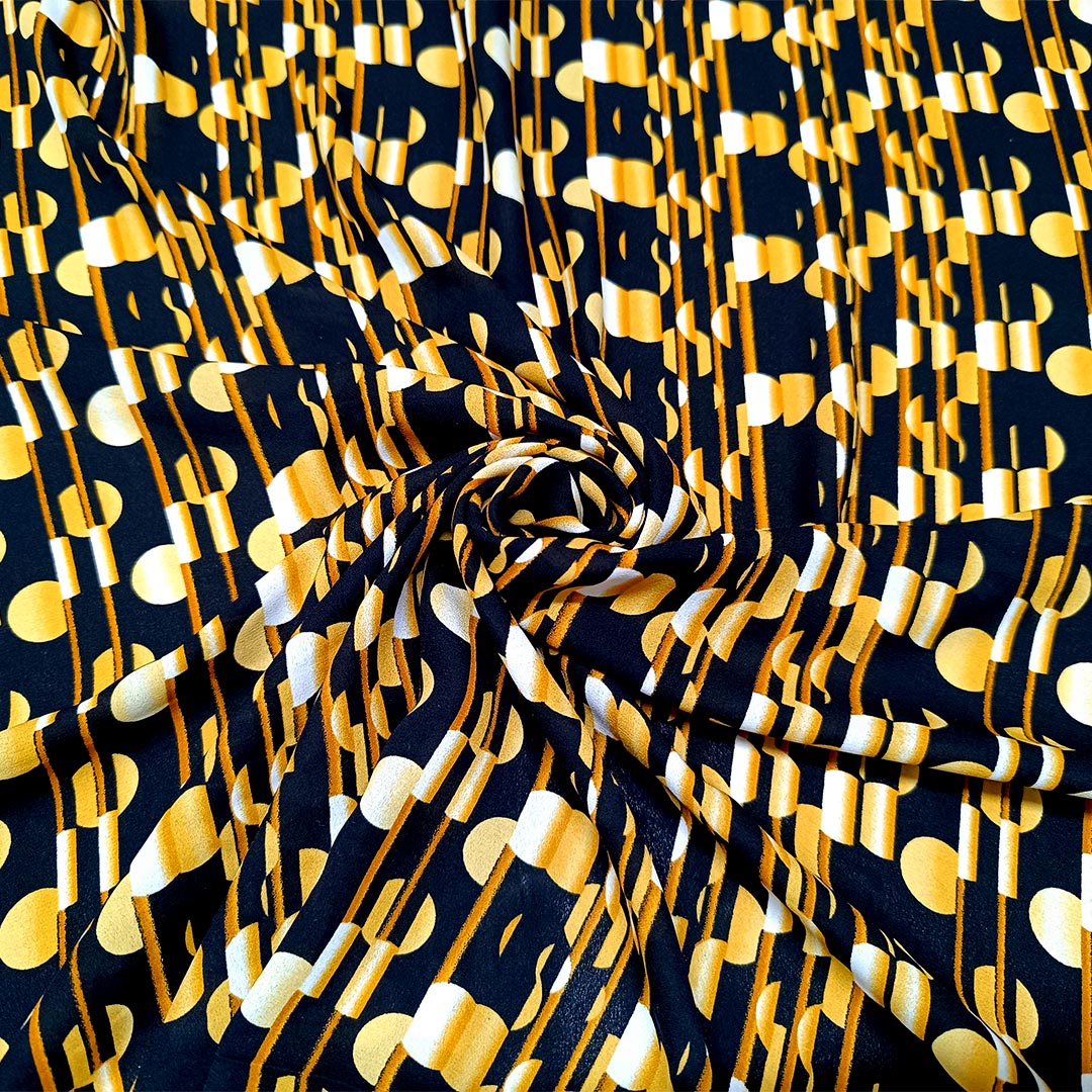 Tessuto Crepe a fantasia motivo geometrico giallo – nero – ocra