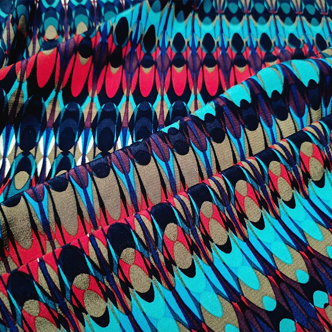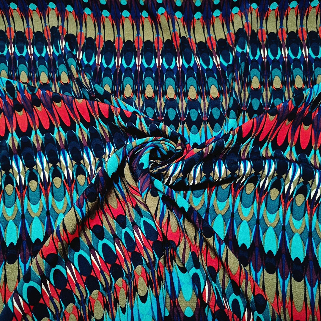 Tessuto Crepe a fantasia motivo geometrico turchese – rosso – nero