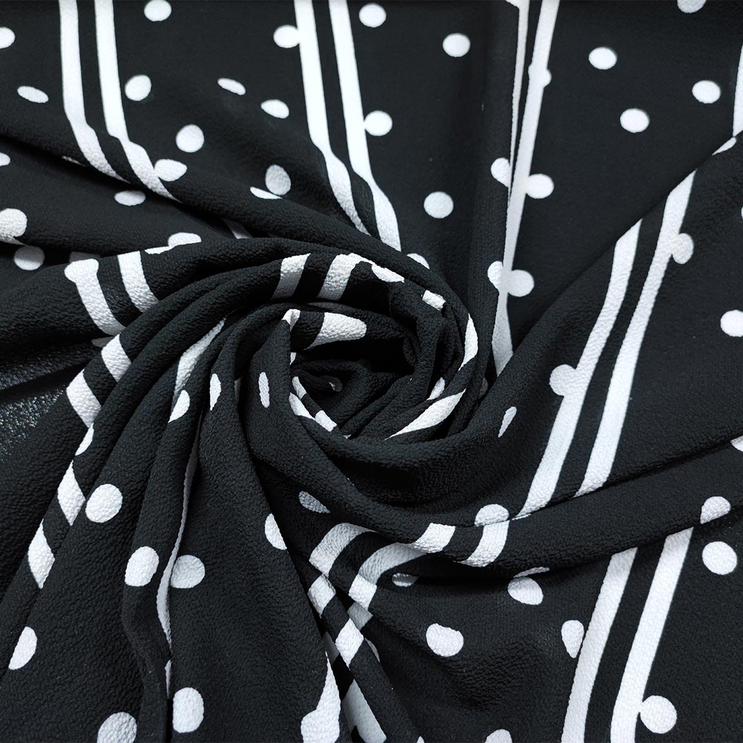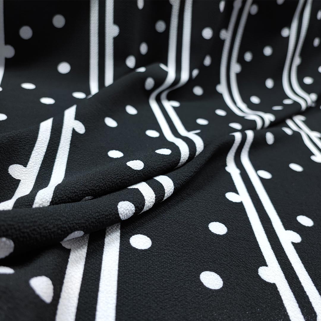 Tessuto Crepe a fantasia dalla mano rugosa, leggera e morbida, leggermente elasticizzato. Ideale per realizzare capi freschi e comodi come: abiti, camicie gonne e bluse.