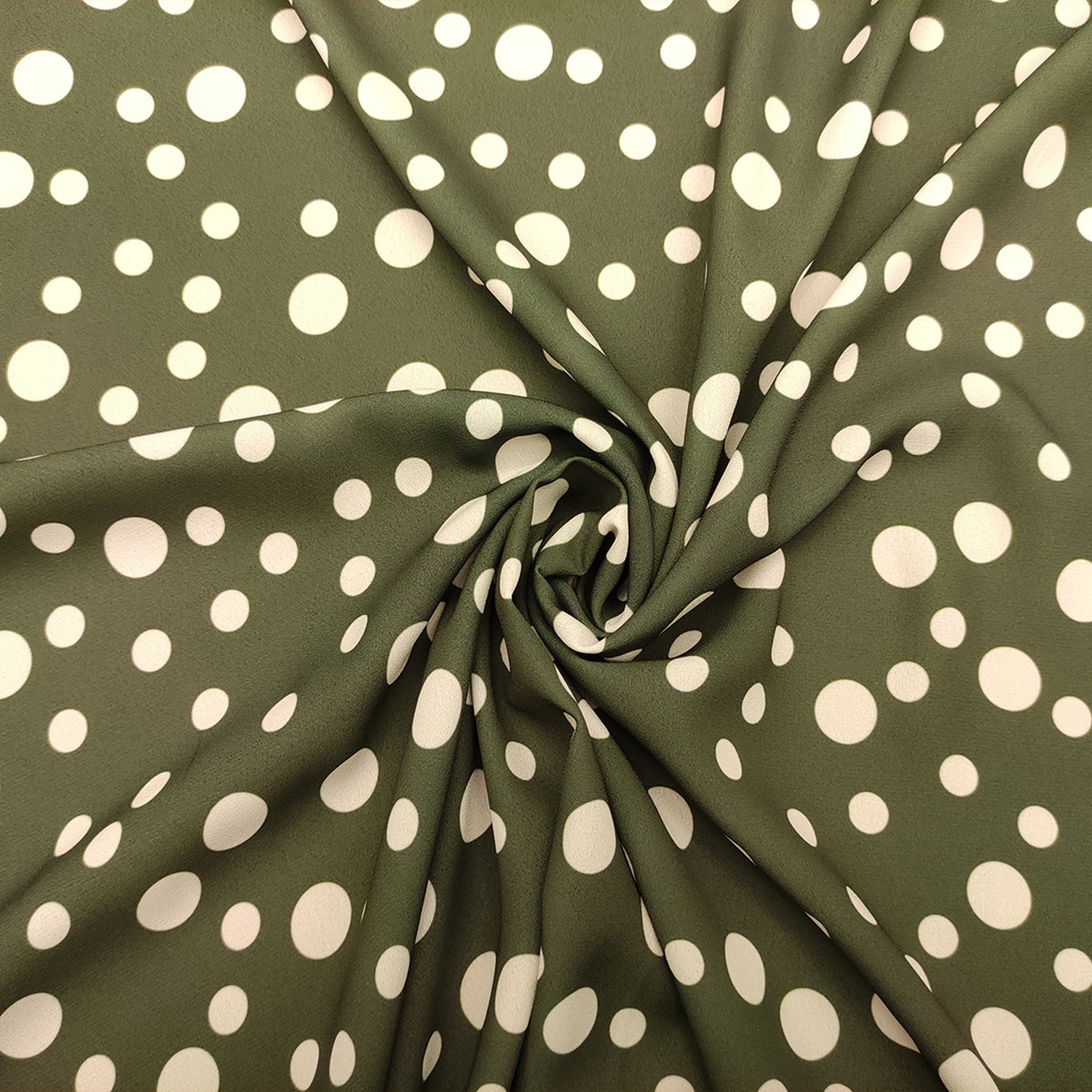 Tessuto Crepe a fantasia motivo pois verde militare – champagne